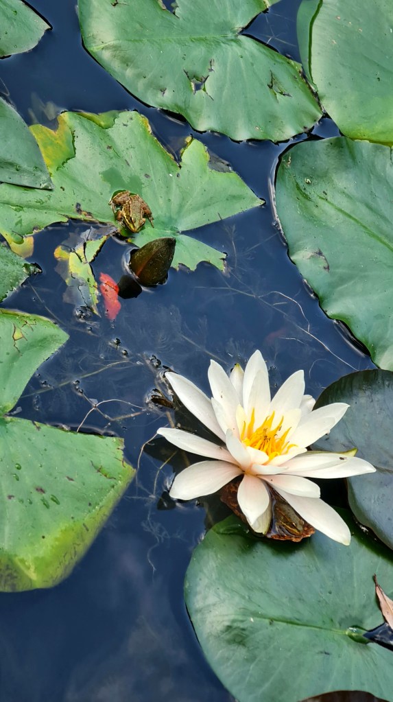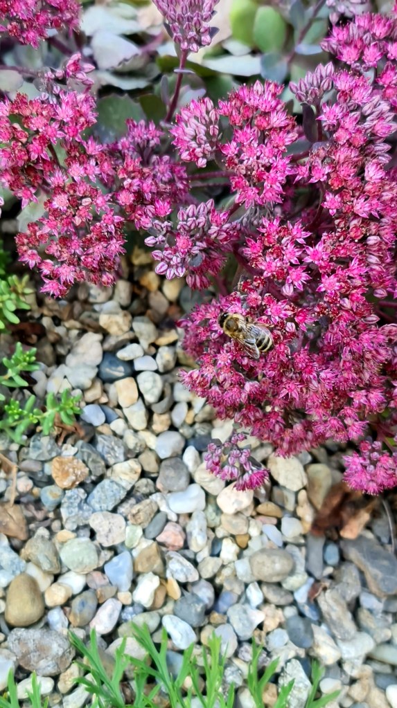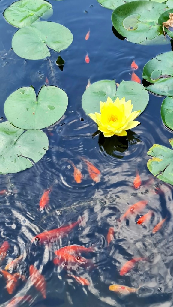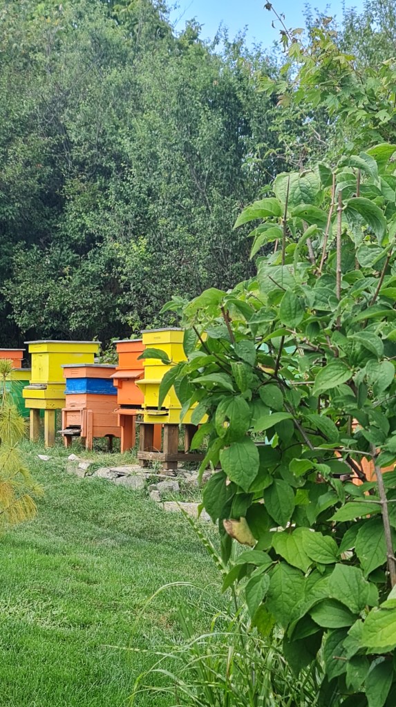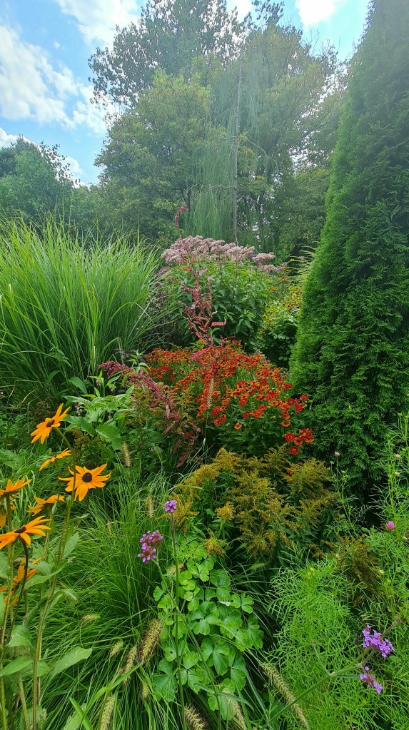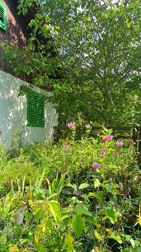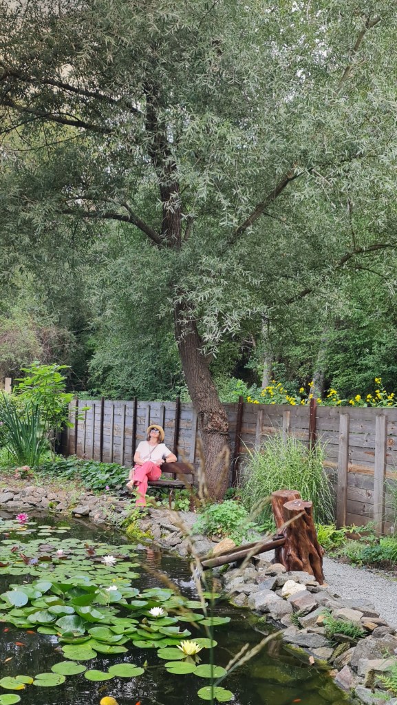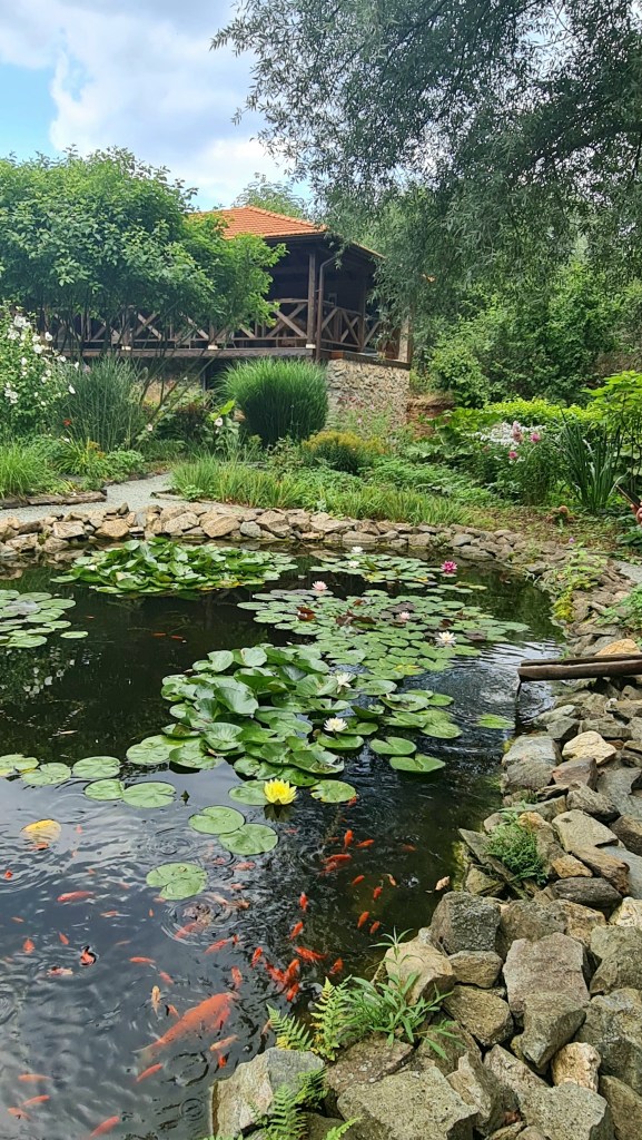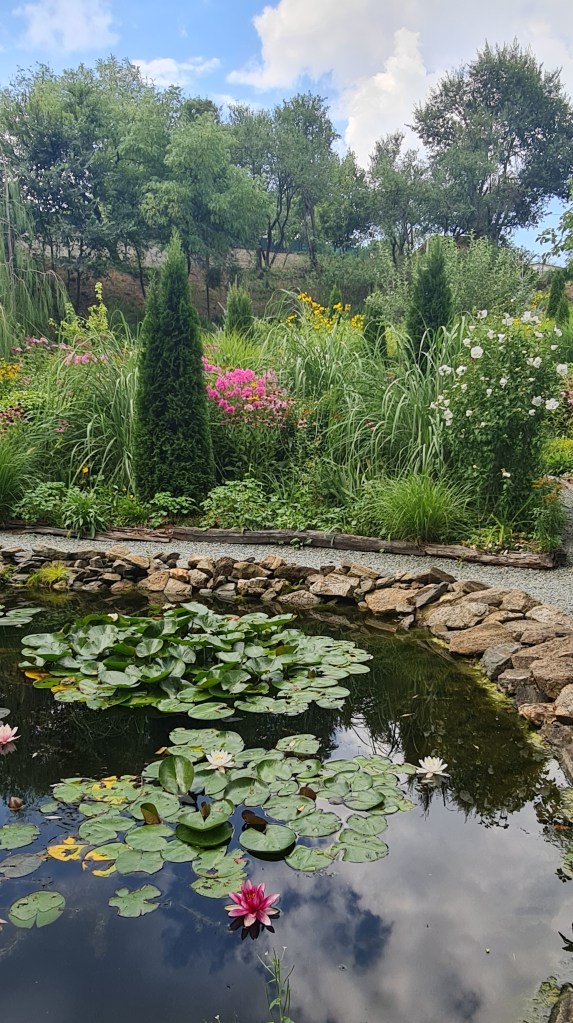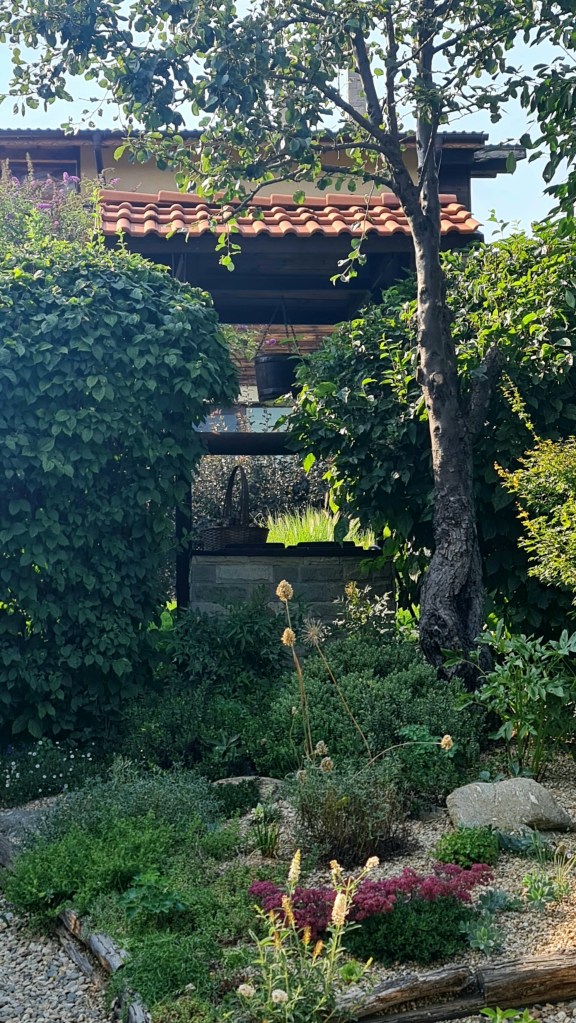 Има дървета, храсти, пълзящи и покривни растения, сукуленти, декоративни треви. В двете езерца рибки плуват около водните лилии и жаби се гмуркат с плясък, когато се доближите. Приятни акценти – фенери, фигурки, шишарки – допълват идилията. Ясен има няколко кошера и приятното жужене на пчелите, допълнено от ромона на вода в езерцата ще озвучи разходката ви. В ниската част на градината има веранда с места за сядане И прекрасна гледка, където можете да изпиете чаша домашна лимонада с бъз или сок от арония.