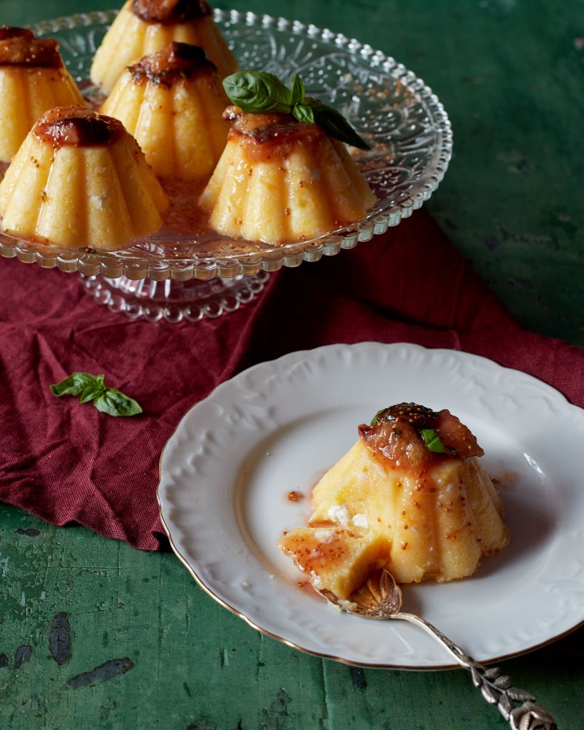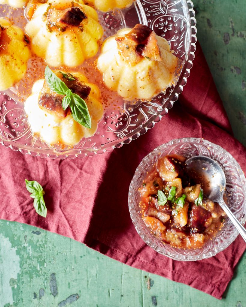 Сега състоянието на смокините просто не позволяваше да чакам да намеря салвия, затова направих няколко корекции в първоначалната идея. Вместо класически качамак/полента, направих кексчета. Вместо синьо сирене сложих козе саламурено и вместо салвия – босилек. А презрелите смокини направих на нещо като бързо сладко. Сега си мисля, че естетически щеше да е по-добре ако го бях блендирала, но, както се казва – минали работи, следващия път.