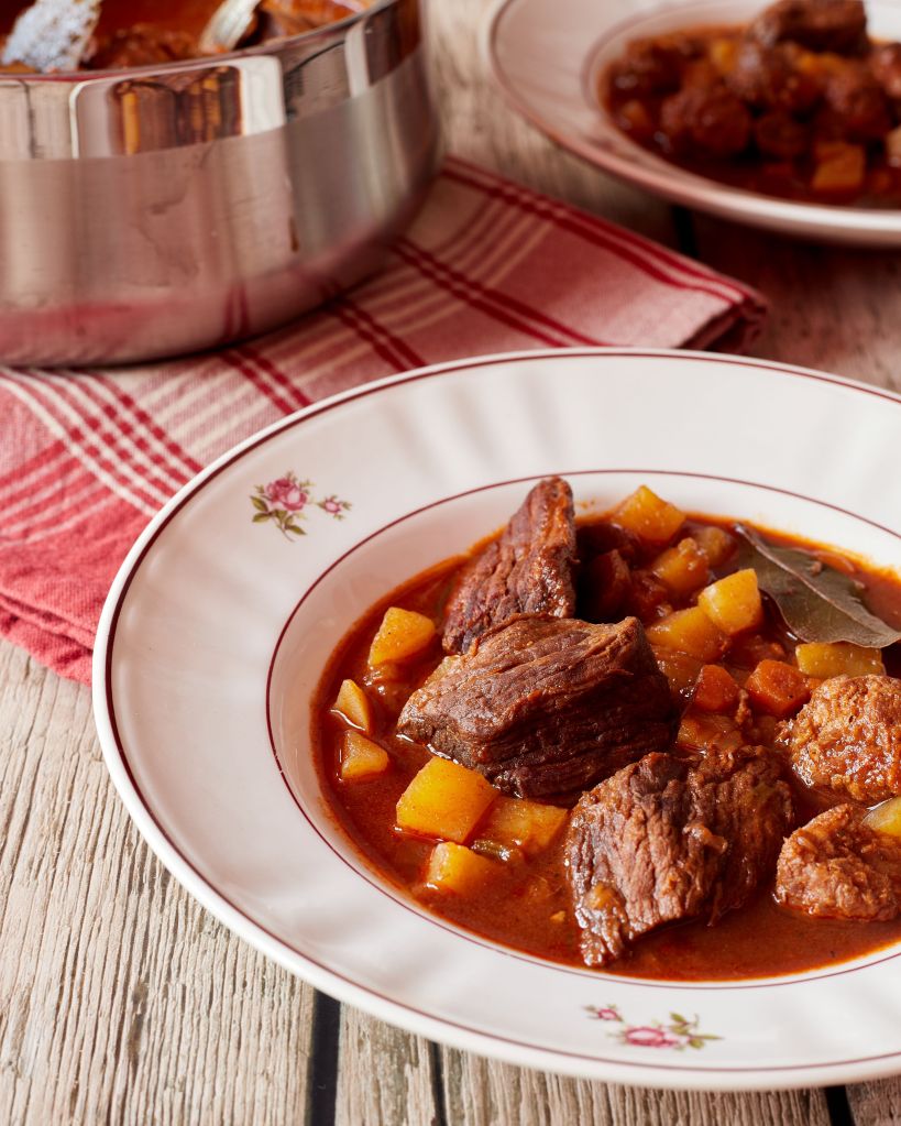 Гулашът за мен е някъде между супата и яхнията. Сосът не се сгъстява, но от дългото готвене става естествено по-гъст и по-малко в сравнение с класическа супа. Определено може да бъде и основно ястие, понеже е достатъчно засищащ. Обикновено се прави с говеждо, но често се слага и наденица. Зеленчуците са лук, моркови, целина (или селъри) и картофи. Ще намерите и вариант с хлебни кнедли. Месото обикновено не се маринова във вино, но аз имах време и, понеже тази подготовка винаги подобрява вкуса, го направих.