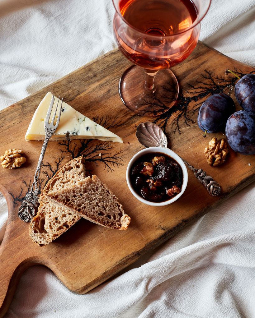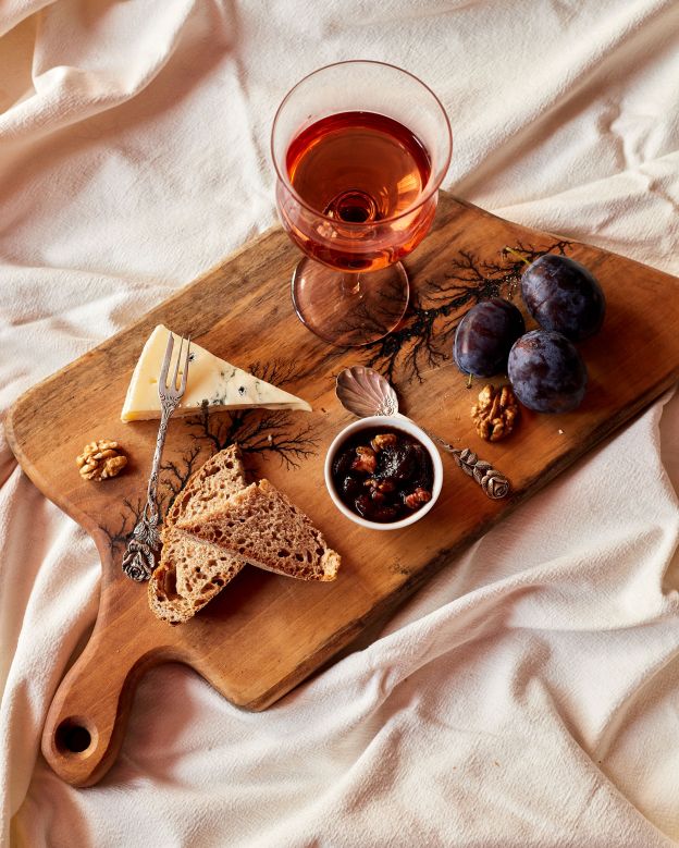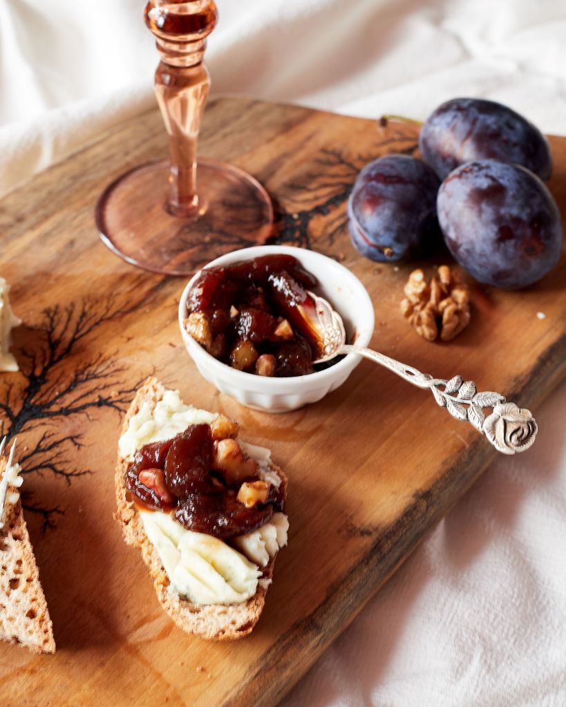 250 г сини сливи, почистени и нарязани – формата е по желание, но, ако ще искате да ги обелите, може би е по-добре да ги оставете на половина, за да ви е по-лесно