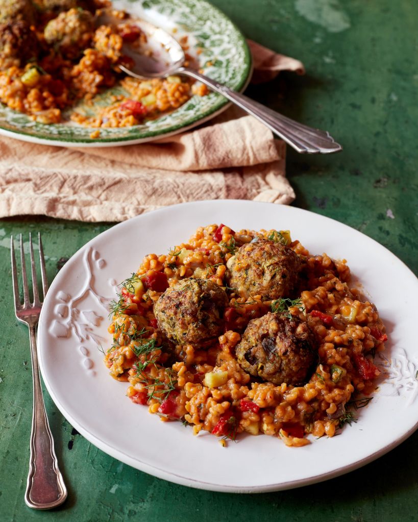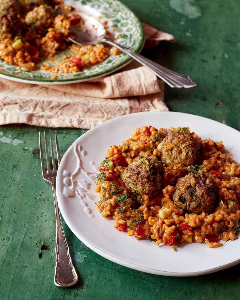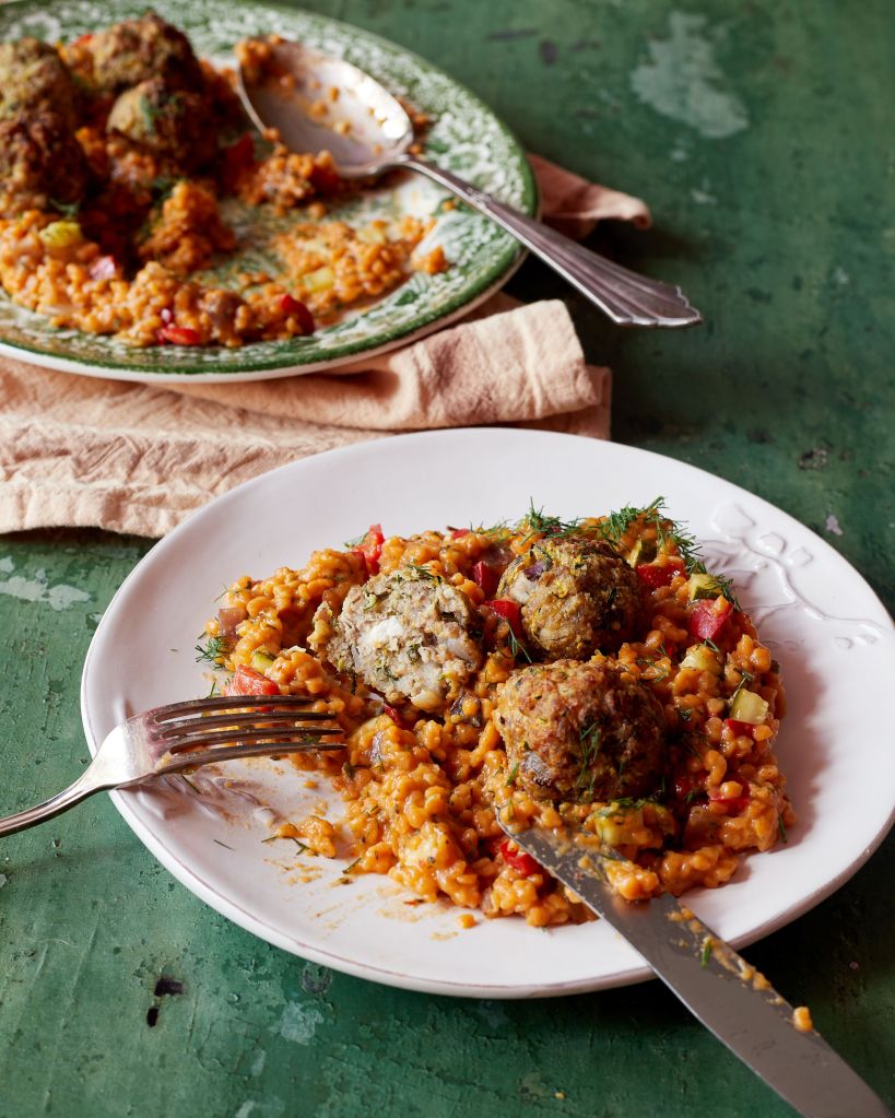 Взех си и една книга за модерна гръцка кухня, където има рецепти с трахана. Тази не е точно от там, но определено е повлияна. Имах мляно пуешко месо и три малки тиквички, които трябваше да се употребят веднага. Това ми даде идеята за кюфтенцата. Траханата, сготвена с бульон и зеленчуци, е гарнитура към тях.