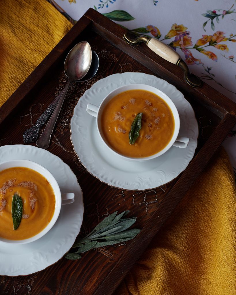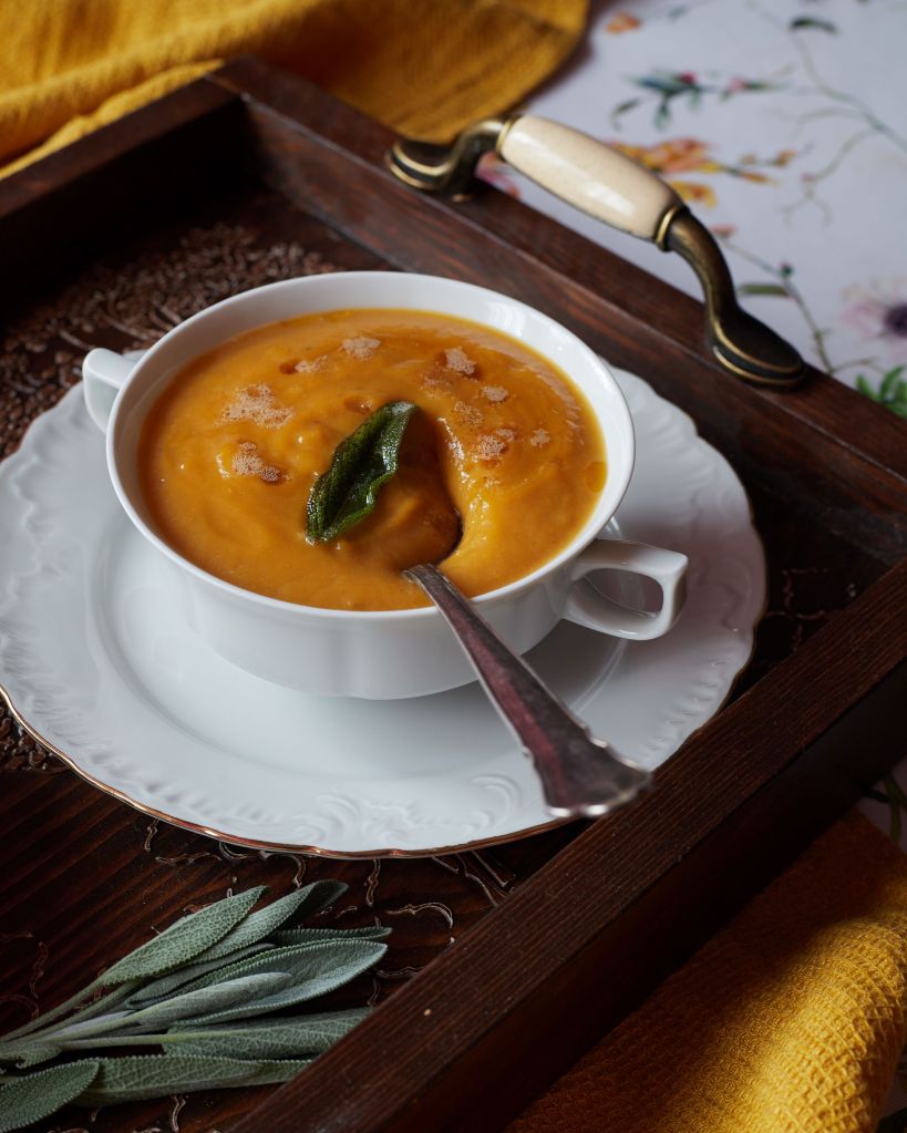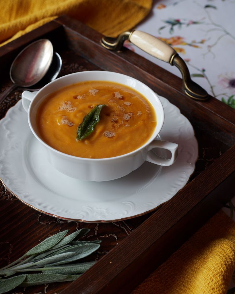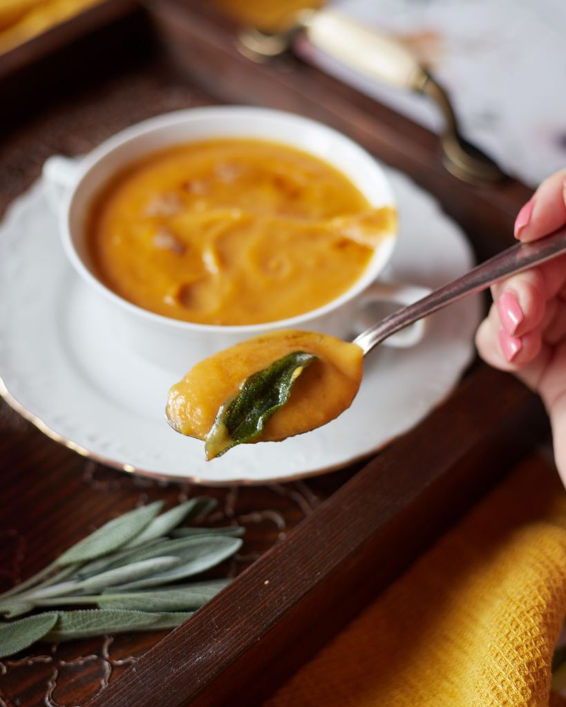 Изпекох тиквата, заедно с малко картофи, шалот и чесън. Към печелившата комбинация добавих чипс от салвия и кафяво масло и резултатът беше наистина впечатляващ. Мек, леко сладък вкус, допълнен от аромата на маслото и салвията. Просто, лесно и съвършено. Непременно трябва да опитате тази супа.