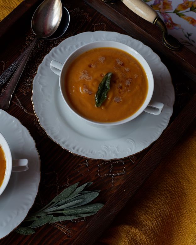 В тиган загрейте маслото, докато се разтопи и докато леко покафевее. Добавете листата салвия и гответе, докато станат хрупкави – минута, две. Сервирайте супата с няколко капки кафяво масло и чипс от салвия.