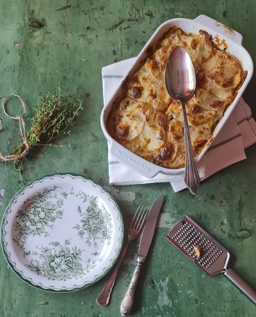 За тази рецепта ряпата и картофите трябва да се нарежат много тънко и е най-добре да се използва мандолина. Аз имам, но никак не я обичам и дори я бях увила във фолио, готова за подаряване на първия желаещ. Тази ряпа ме накара да я извадя и май ще я задържа засега, защото, ако пак ми попадне ряпа, ще приготвя този гратен отново и като нищо ще пропусна картофите 🙂.