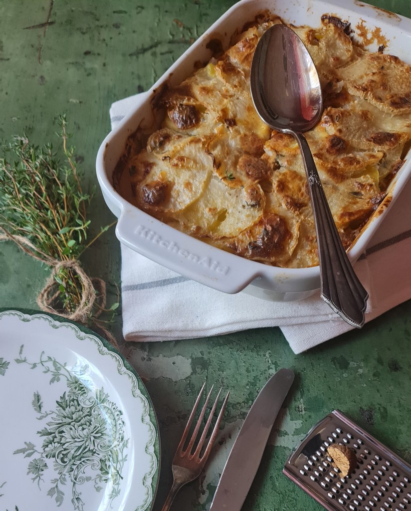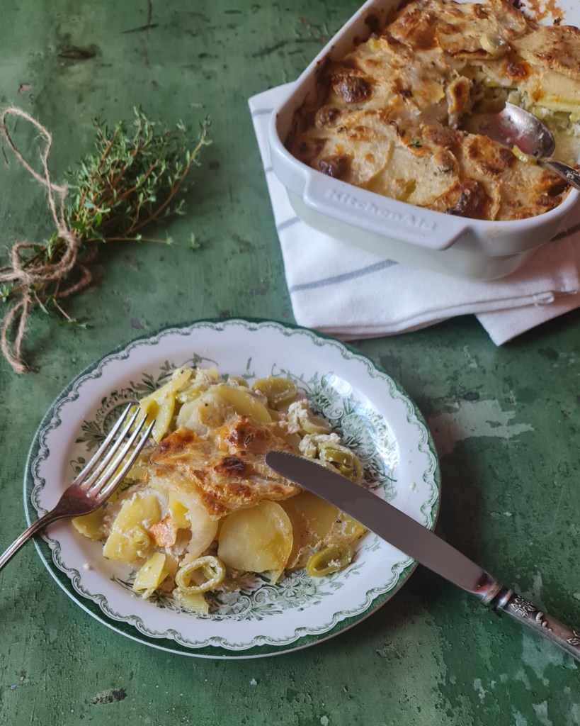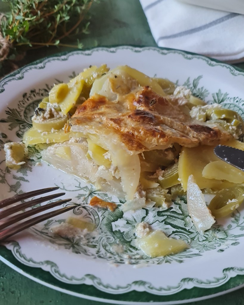 За пръв път готвя ряпа като главен герой в ястието. Преди съм я ползвала основно като гарнитура на печено месо и понеже не бях сигурна как ще стане, заложих на по-сигурното и сложих и същото количество картофи. Празът влезе по средата, като плънка, между два слоя картофи и ряпа. За спойка направих бешамел, обогатен със заквасена сметана и синьо сирене. Резултатът беше УАУ 😀.