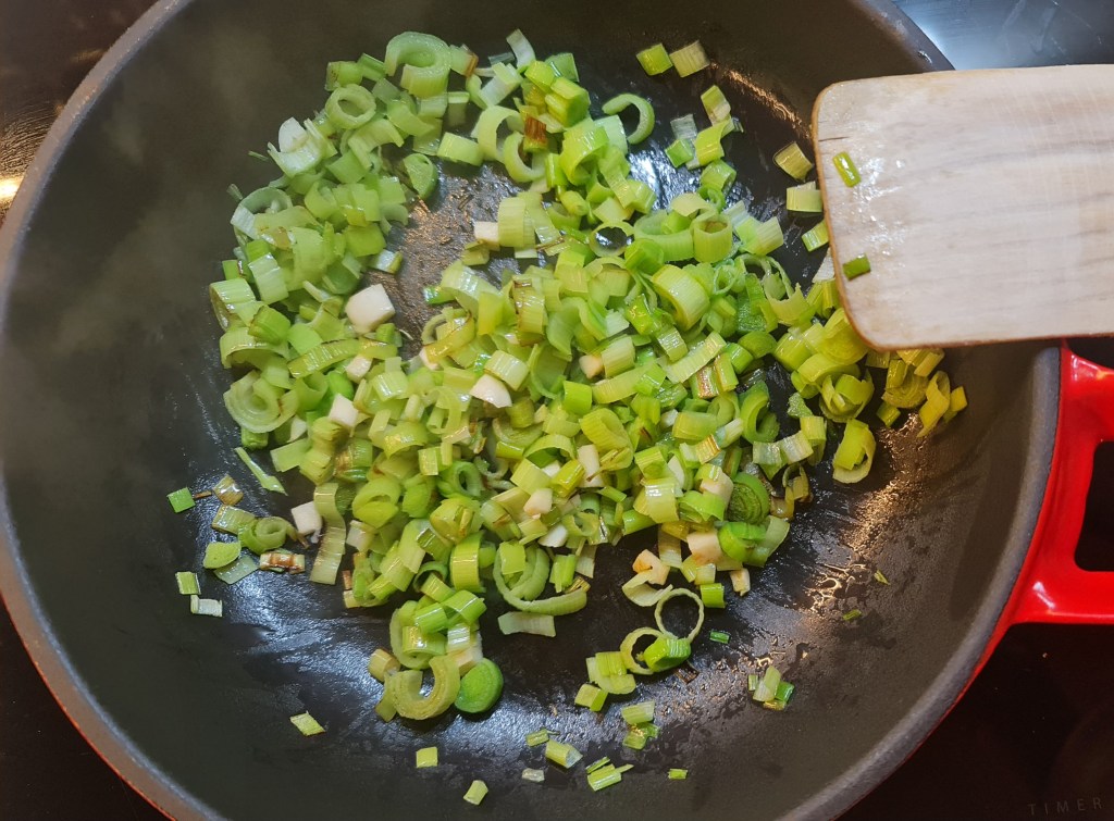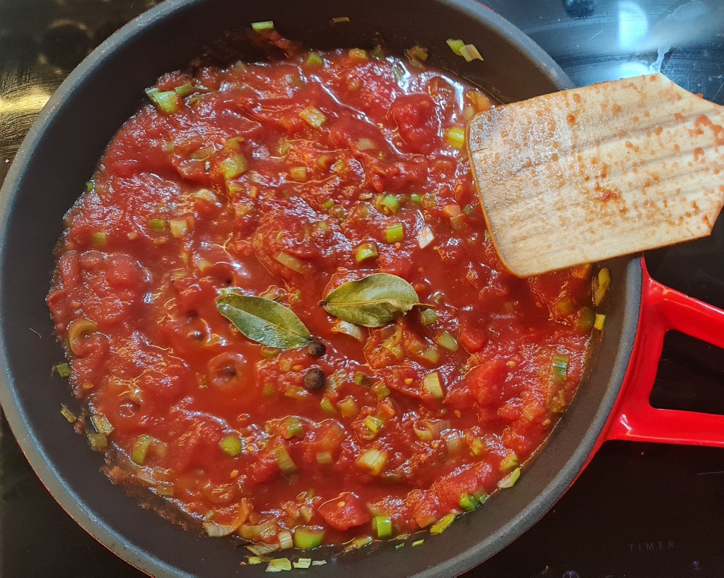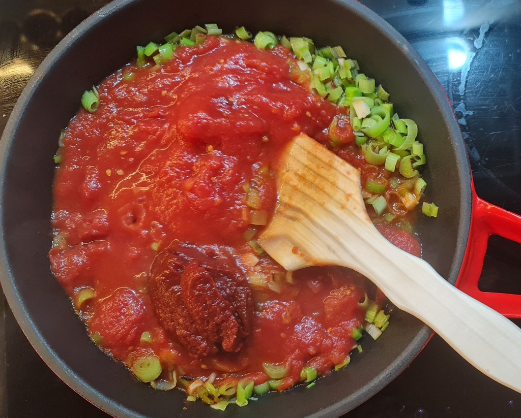 Загрейте зехтина на средна степен в дълбок тиган или тенджера. Добавете праза и гответе около 5 минути. Добавете пресования чесън, разбъркайте и добавете доматите и доматеното пюре. Гответе 5-10 минути и добавете бульона, дафиновия лист и бахара. Подправете с кимион, сол и черен пипер.