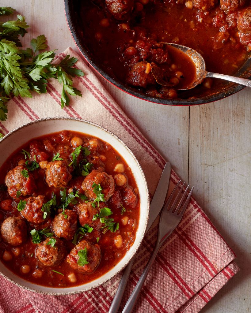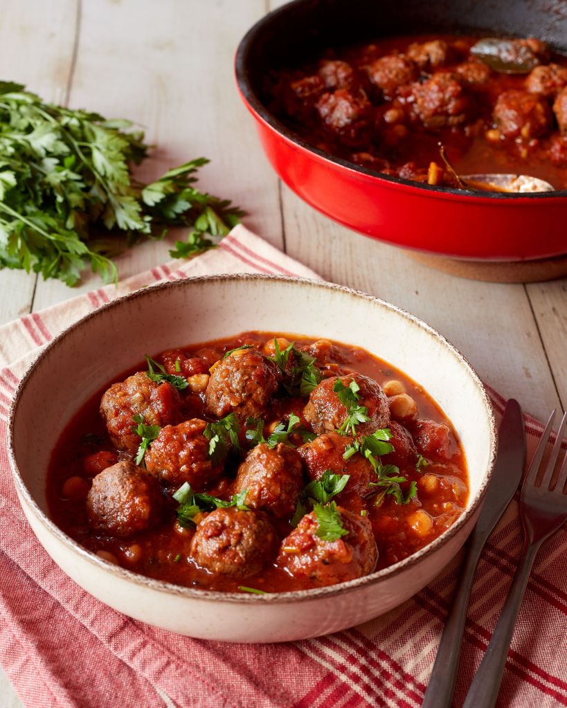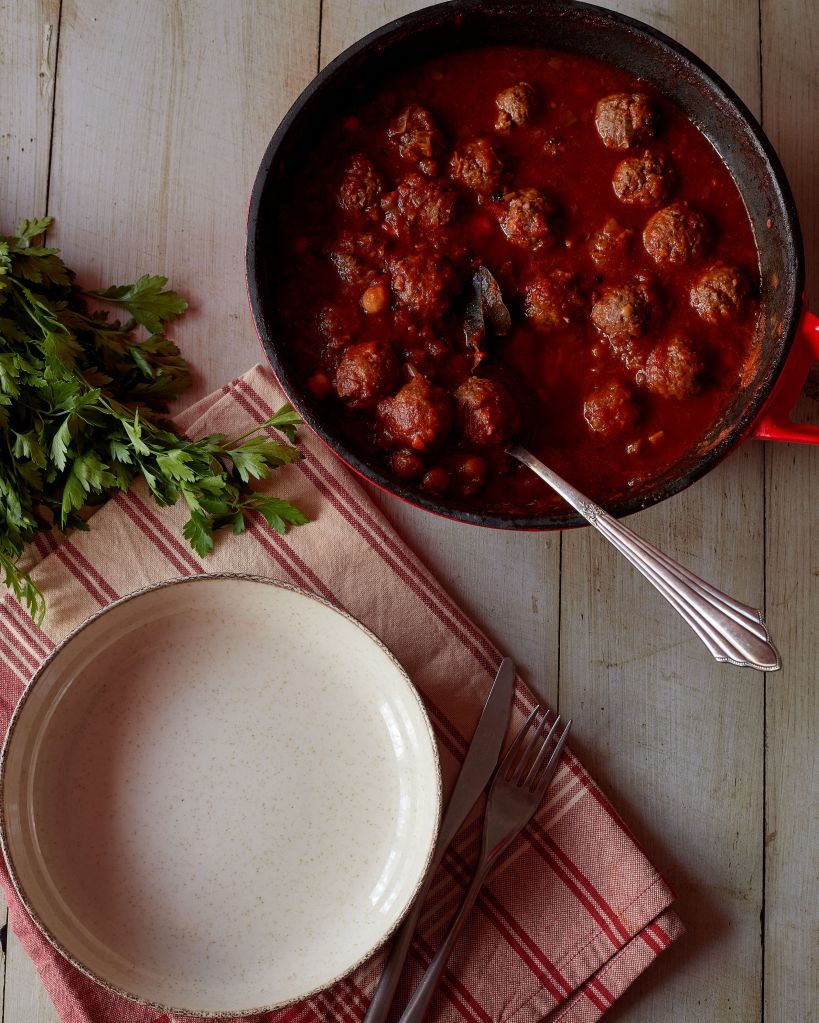 Истината е, че имах една кайма от 100% говеждо, която отлежаваше от няколко дни в хладилника и трябваше да й измисля приложение. Поразгледах и попаднах на една рецепта за яхния с агнешки кюфтенца, с претенции за северноафрикански корени. Хареса ми и я преработих в тази идея, която, разбира се, можете да направите и с друго мляно месо.