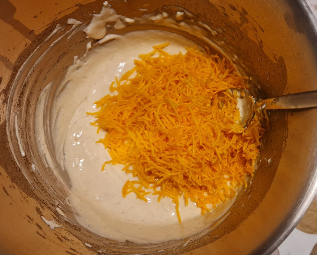 С миксер разбийте яйцата с еритритола до пухкава смес. Добавете изварата и отново разбийте, докато получите гладка кремообразна смес. Добавете настърганата тиква и стафидите и разбъркайте добре.
