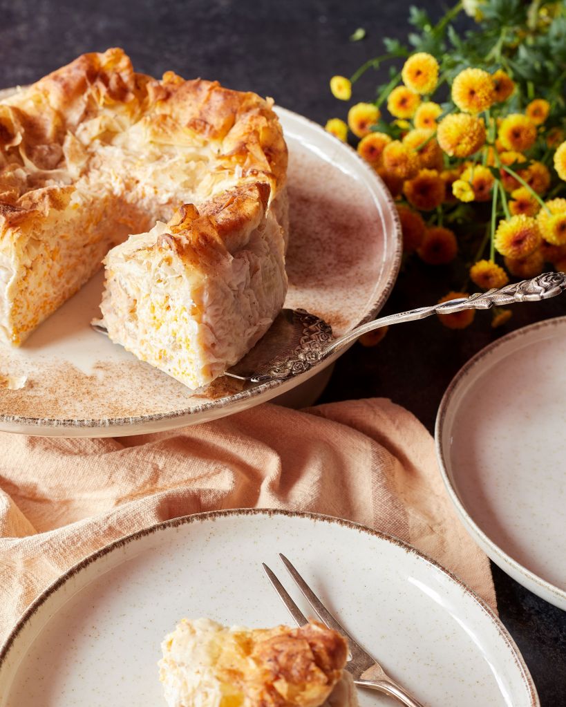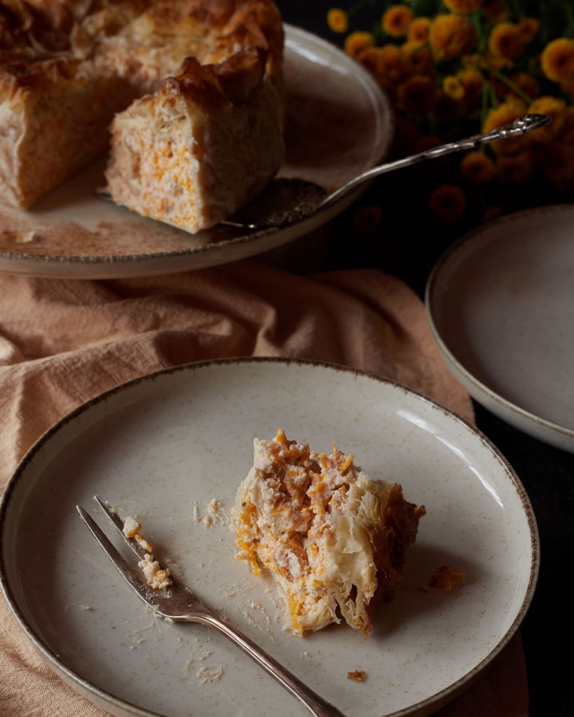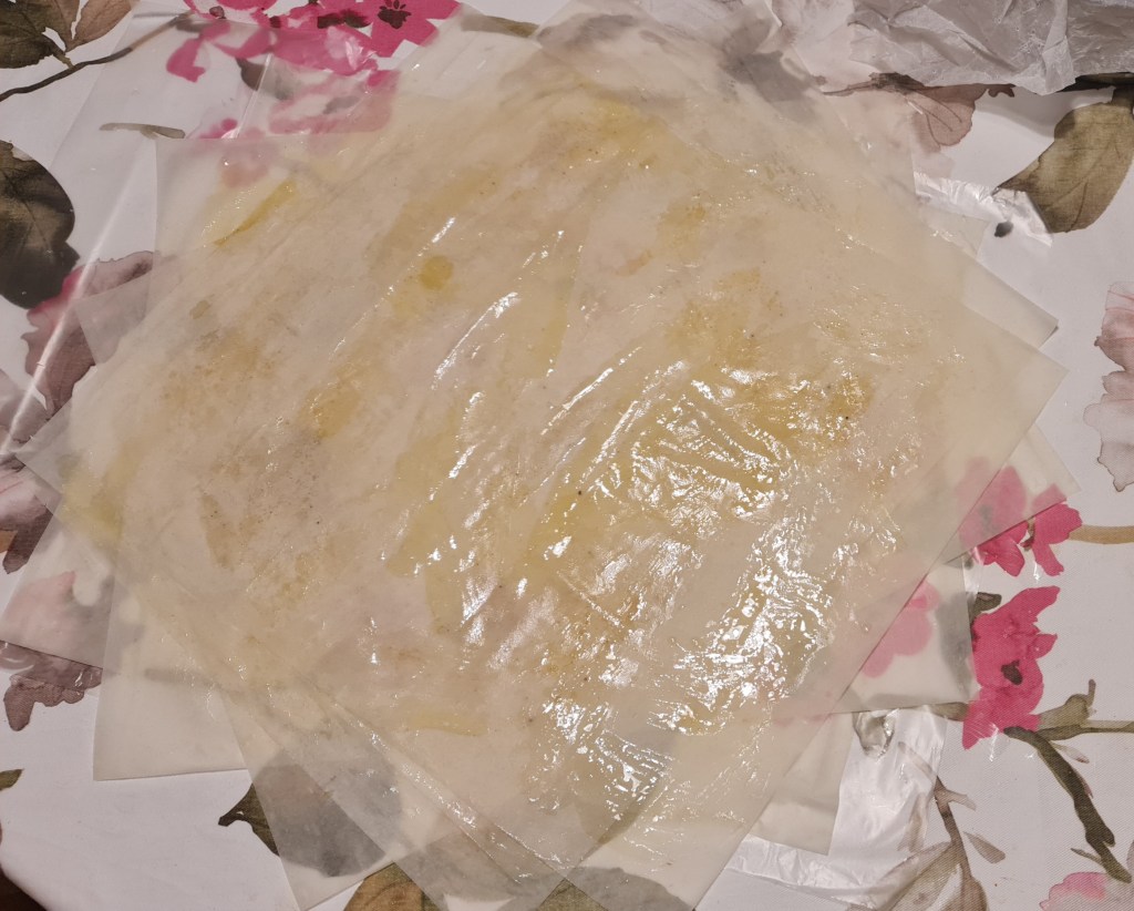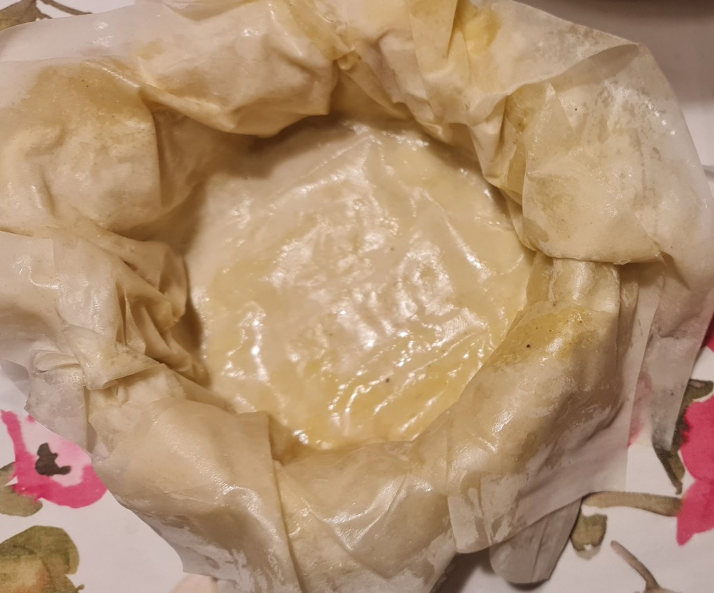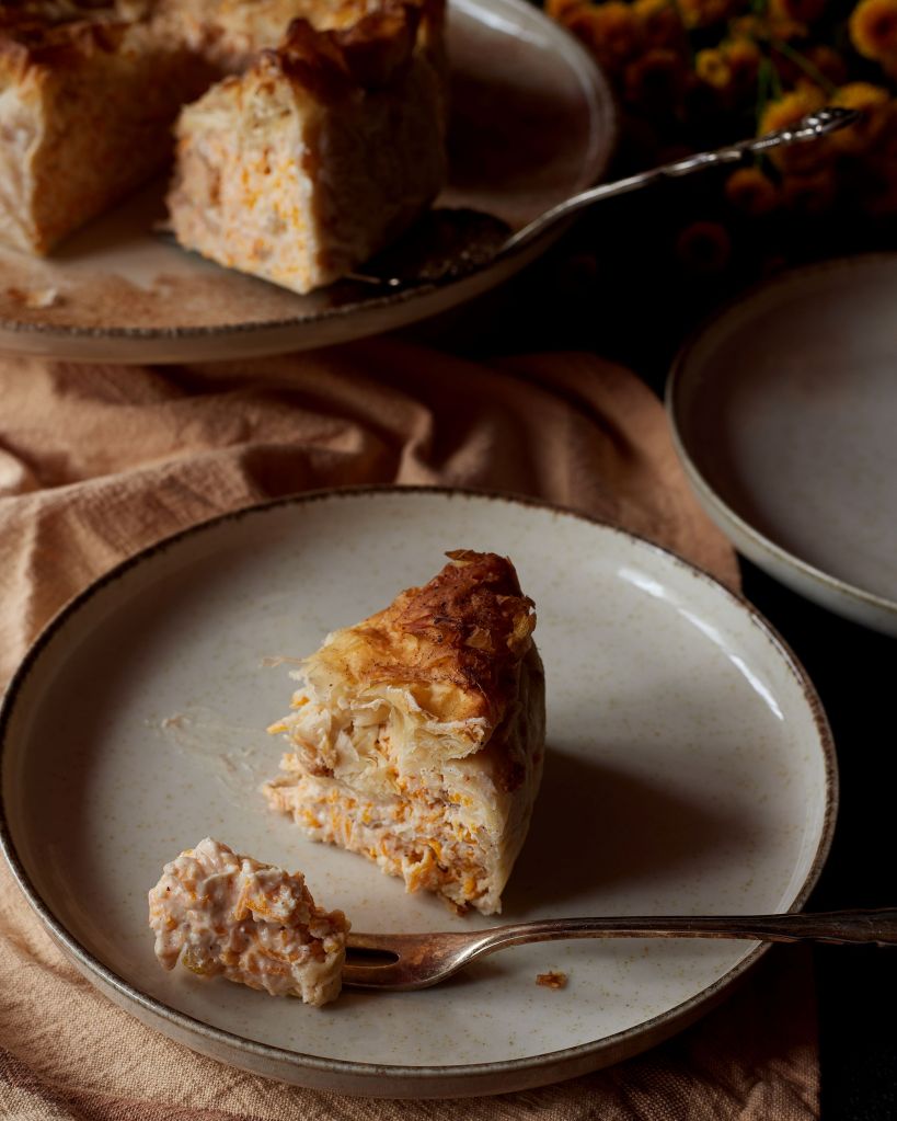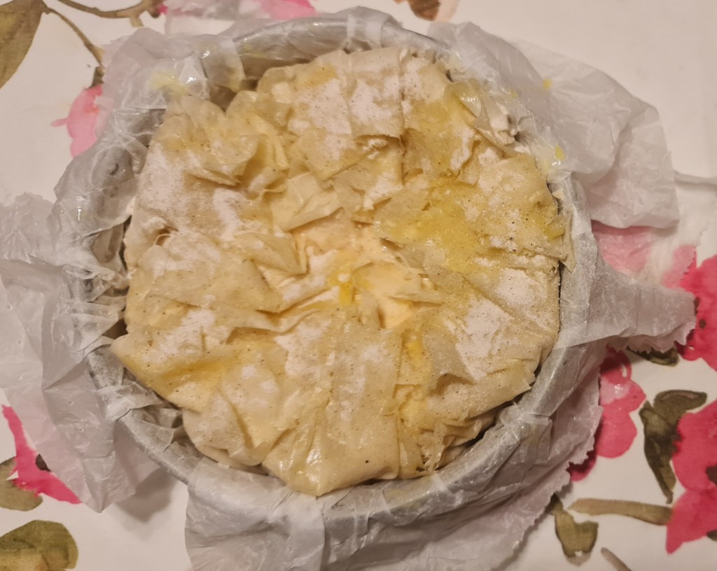 Е, получи се. Не просто прилично, а наистина вкусно. Корите за баница, намазани с масло и поръсени с еритритол (или захар), наредени една върху друга, оформят обвивката. Пълнежът е от извара, яйца, настъргана тиква и стафиди.
