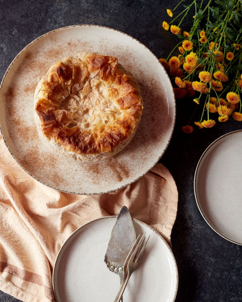 Разгънете една кора и намажете с масло. Поръсете с половин с.л. от заделения еритритол. Отгоре сложете втората кора, като завъртите леко под ъгъл. Намажете с масло и поръсете с еритритол. Повторете така до последната кора. Трябва да ви останат малко масло и еритритол.