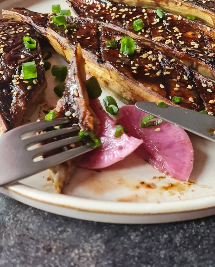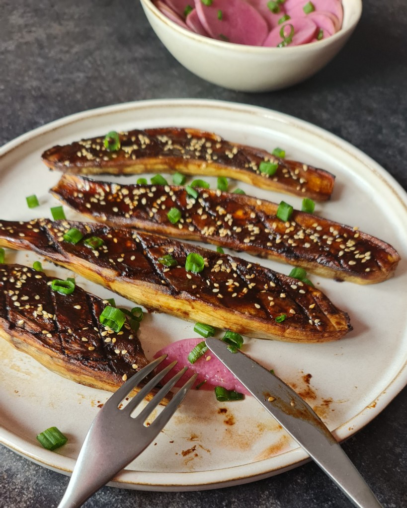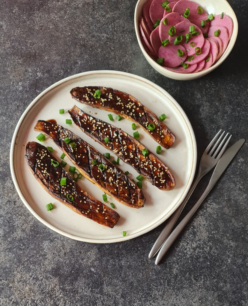 Глазираните патладжани може да бъдат както предястие, така и основно. Аз ги сервирах с маринованата ряпа, която бях приготвила напоследък.