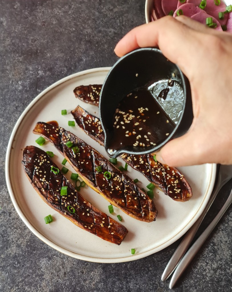 Тя е вариант на японска класика и може да се направи с всеки сорт патладжан. Единственото, което трябва да се адаптира, е продължителността на готвенето, която тук е предвидена за т.нар. японски сорт. За по-месести ще е необходимо повече време.