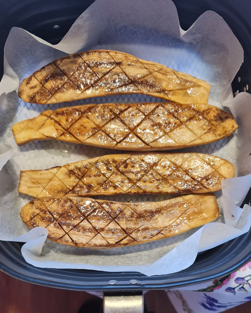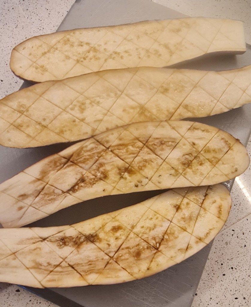 Първото нещо, което сготвих след малко над седмици почивка, наложена по здравословни причини. Имах два дълги и тънки патладжана, които или трябваше да сготвя, или да прежаля.