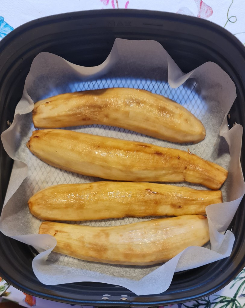 Глазурата може да се приготви без готвене – аз избрах този вариант. Алтернативата е да загреете и да разбъркате – така по-лесно се разтваря мисото. Смесете всичко в купичка и разбъркайте, докато мисото се разтвори. Намажете патладжаните със сусамово олио, обърнете със среза надолу и гответе 10 минути в Air fryer на 190 градуса. Обърнете, намажете с още малко олио и печете още 10 минути. Намажете с глазура, поръсете със сусам и гответе още 3 минути на 200 градуса.