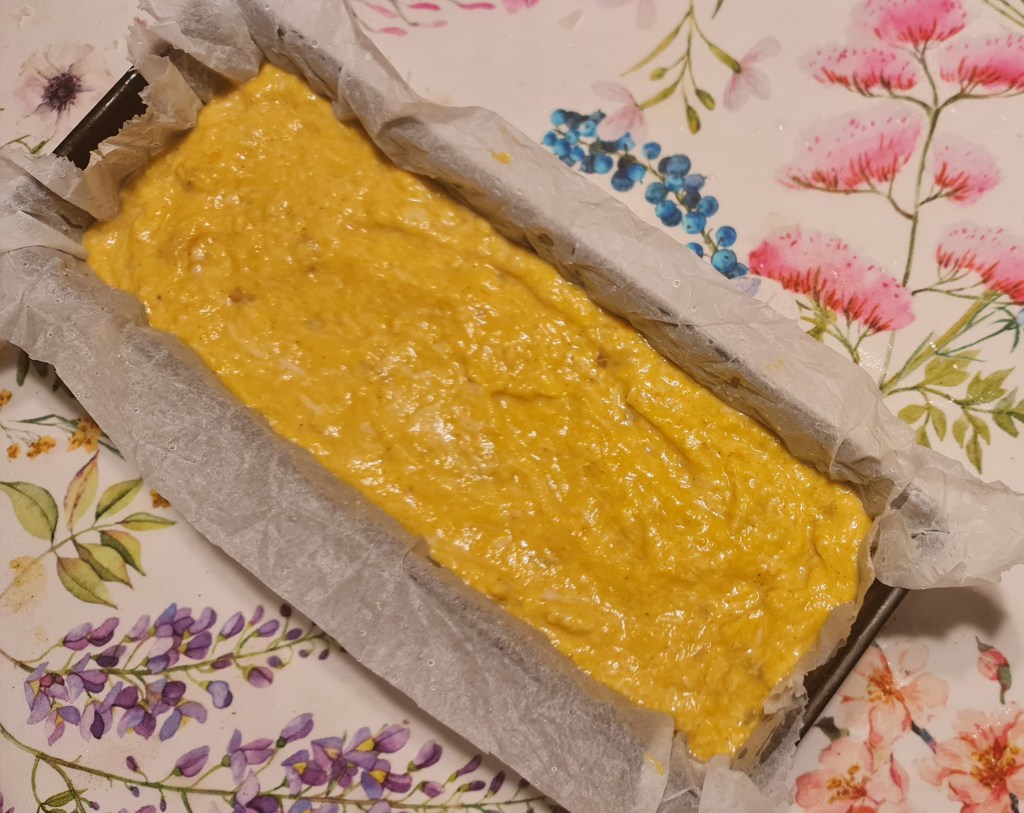 Загрейте фурната до 180 градуса и пригответе правоъгълна тавичка с размери 10 на 30 см, покрита с хартия за печене. Прехвърлете сместа в тавата и печете 50 – 60 минути. Проверете с клечка преди да извадите от фурната и изчакайте да изстине, преди да нарежете.