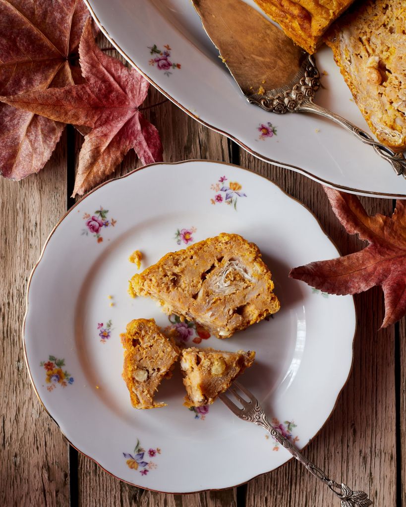 Доста се колебах за името на това печиво. То би могло да се опише и като деконструиран тиквеник с добавени яйца и мляко, но това ми се видя прекалено дълго и с останах с „кейк с тиква“.