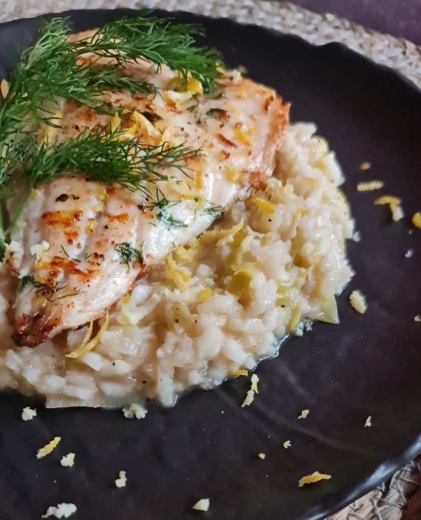 Ризотото е достатъчно хубаво и само по себе си, но добавено към риба е идеалната гарнитура. Приготвя се по традиционния начин с вино, бульон и пармезан и е уникално вкусно. Филетираната и овкусена риба отнема само 5 – 6 минути на тиган. Двете в комбинация са прекрасна празнична вечеря.