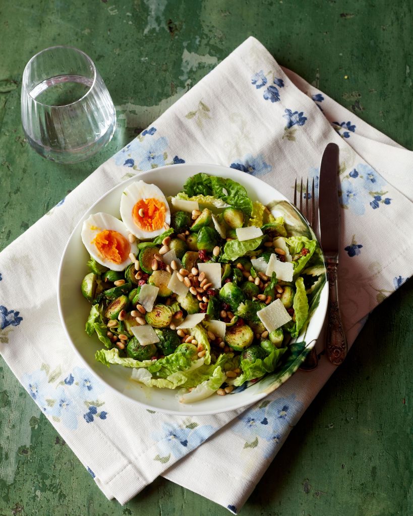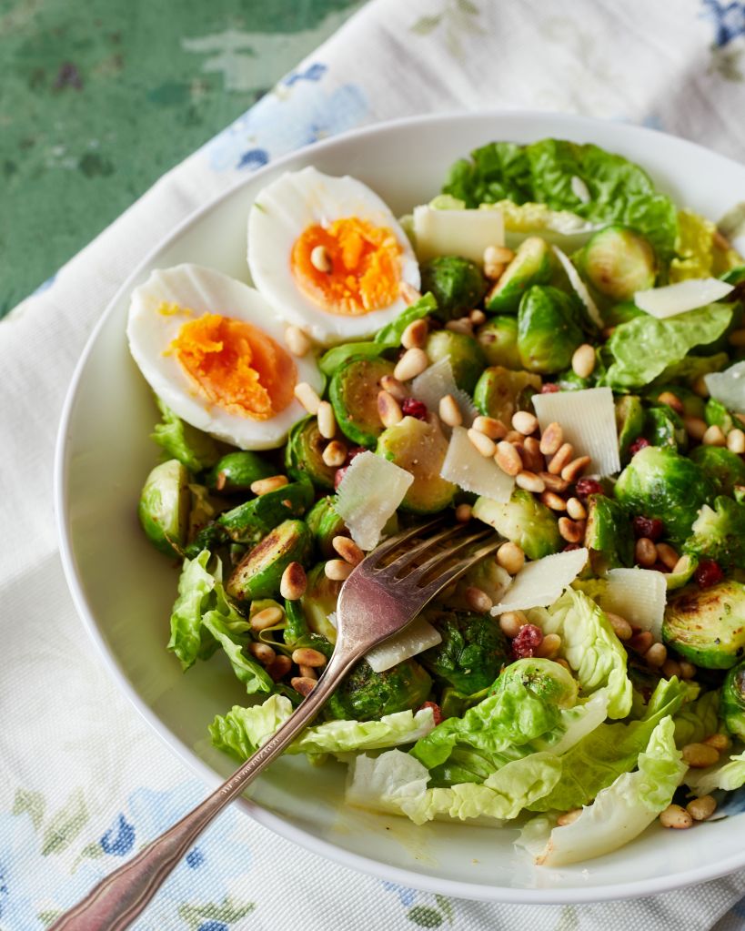 Протеинът в салата идва от сварени яйца. Аз сложих по едно в порция, но можете да увеличите, ако ги обичате и искате да я направите хранителна като за основно. Приготвя се бързо – няколко минути за яйцата, през което време сотирате на брюкселското зеле и запичате леко кедровите ядки. Салатата е идеална за обяд през работната седмица и дори за лека вечеря, в компанията на хубаво бяло вино.