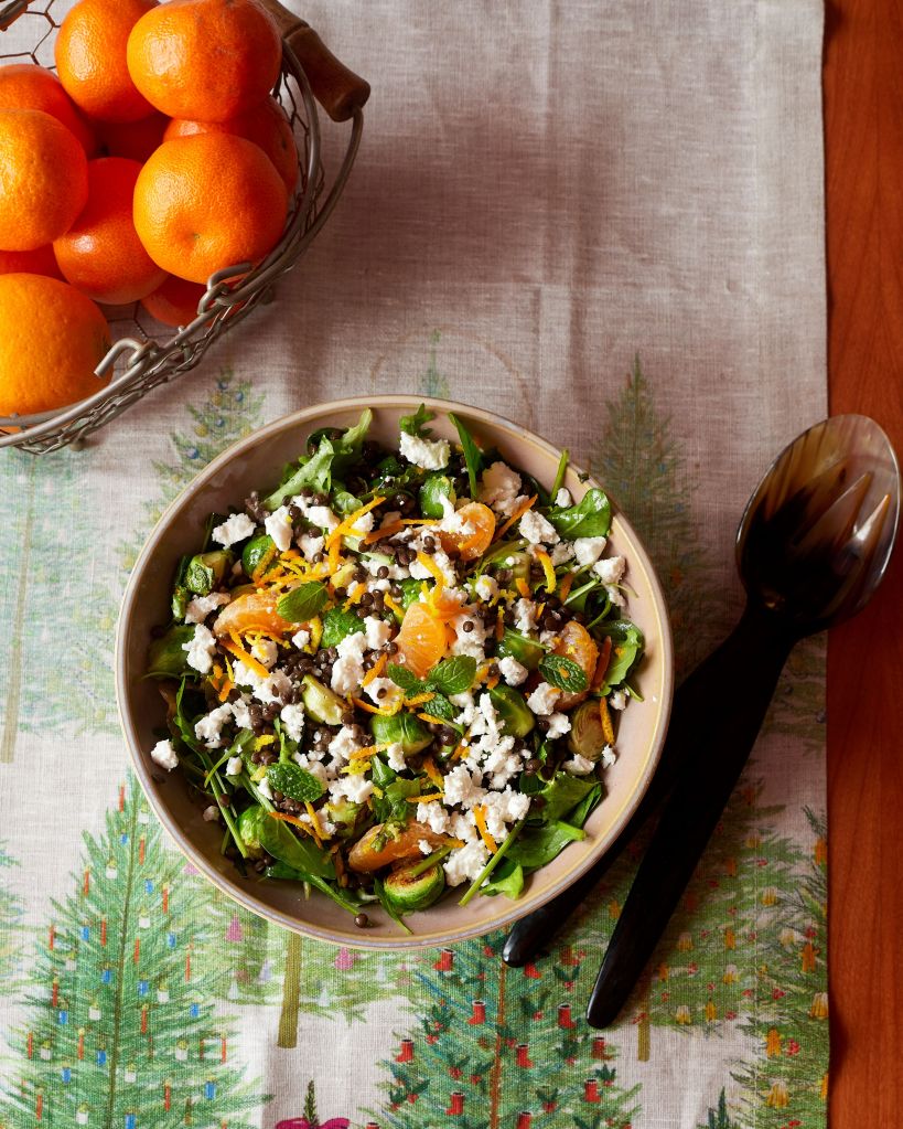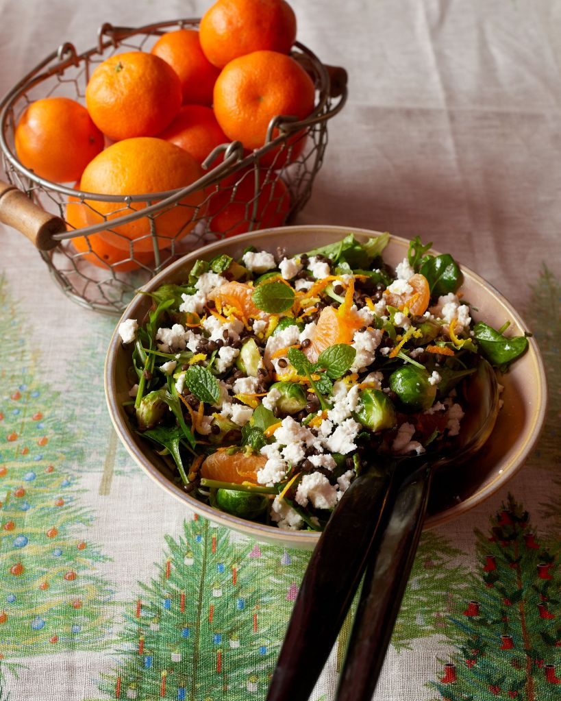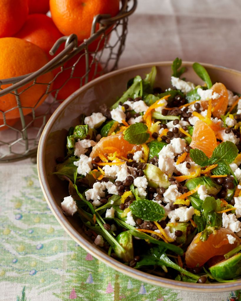 Имам много рецепти с нея и се замислих с какво да я съчетая този път, така че да е хем хранително, хем вкусно, хем красиво. Микс зелени листа, сотирано на тиган брюкселско зеле, мандарини и козе сирене бяха избраниците а сос със сок и кора от портокал завърши картината.