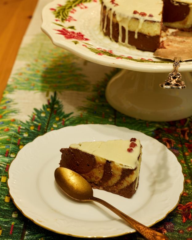 Пригответе форма с диаметър 16 -18 см и свалящи се стени. Намажете с масло по избор или покрийте с хартия за печене. Започнете с тъмната смес, понеже тя е повече. Изсипете около 1/4 във формата и тръснете леко, за да се разпредели равномерно. В средата изсипете около 1/3 от светлата смес и тръснете леко. В средата изсипете около 1/4 от тъмната и т.н. докато свършат. Накрая по повърхността ще имате кръгове от различните цветове. За визуални инструкции за техниката на оформяне вижте тук.