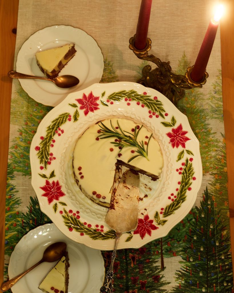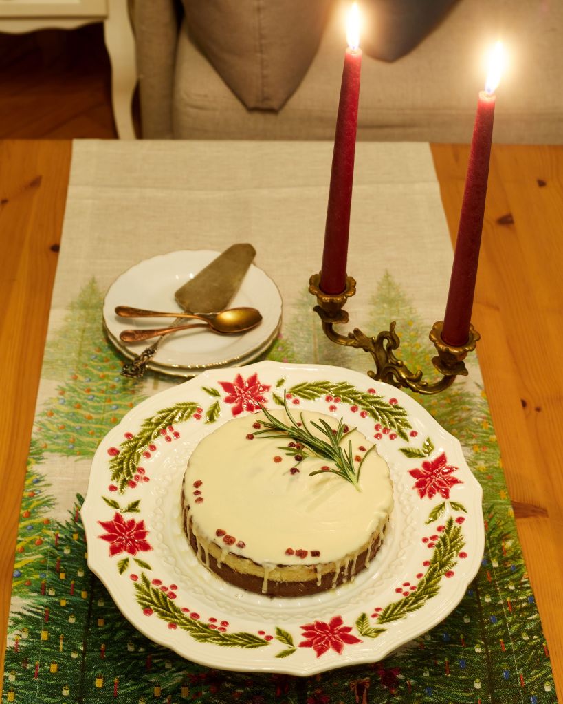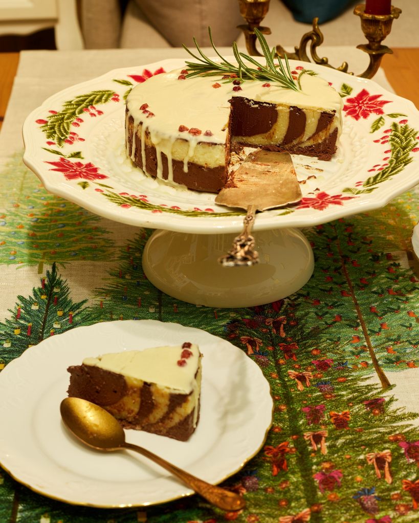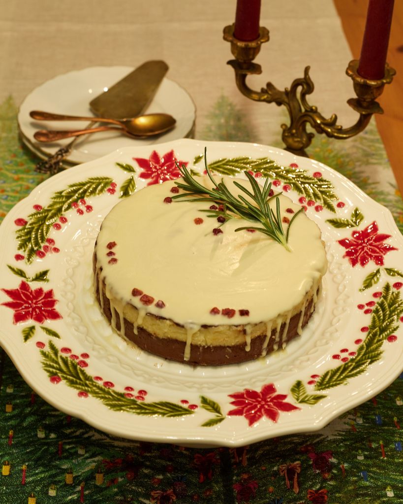 Приберете в хладилника за около 2 часа (ако ползвате кокосово мляко – около час) за да стегне. Декорирайте по желание. Аз разтопих още малко бял шоколад и, след като се охлади леко, но все още беше течен полях тортата. Отгоре декорирах с клонче розмарин и сушени боровинки. След изстиване шоколадът по повърхността стяга и (за да не се начупи като на снимката по-долу) е добре да затоплите ножа леко преди да нарежете.