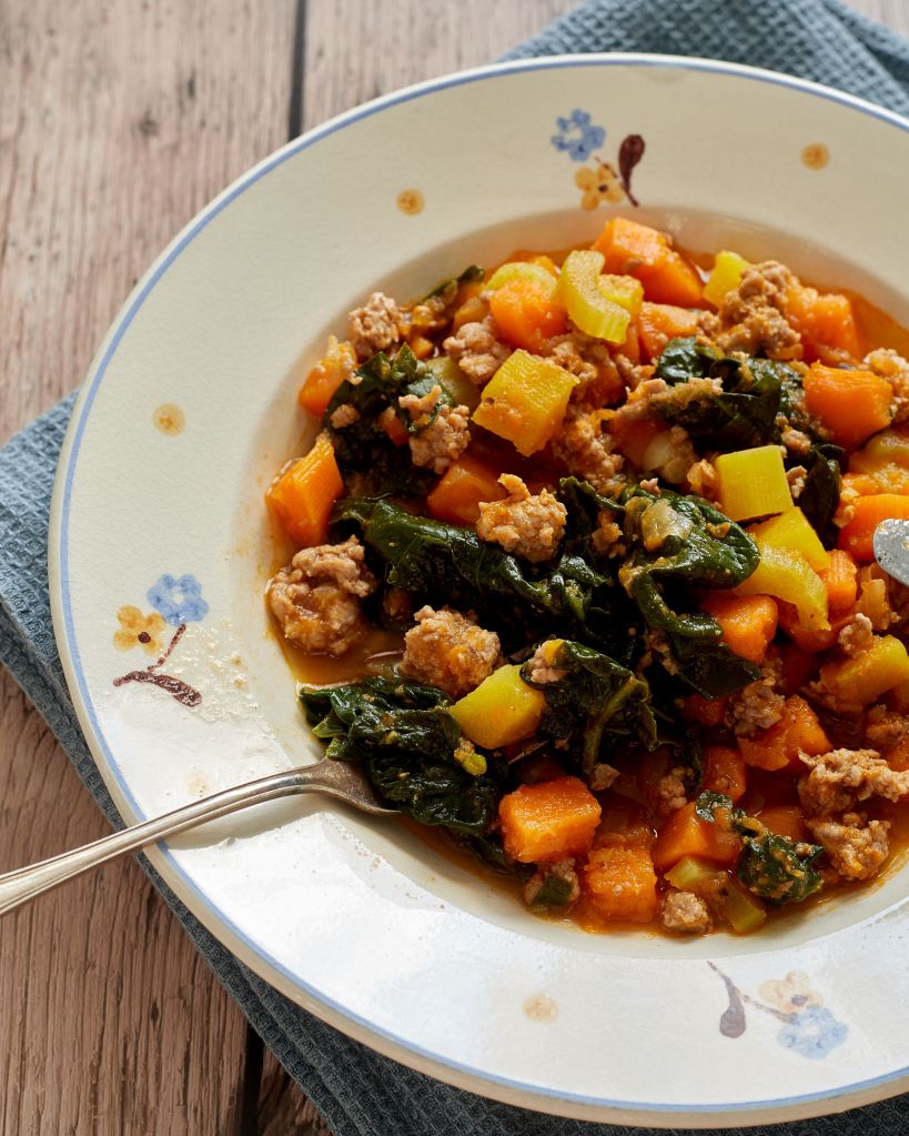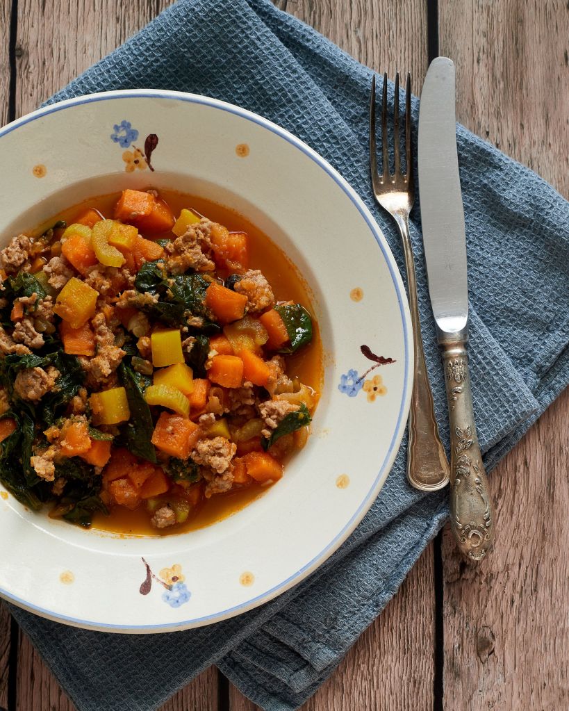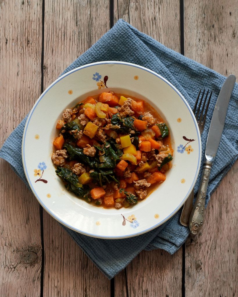 Понеже не разполагам с много време и се опитвам да оптимизирам максимално процесите, промених концепцията. Добавих сладки картофи и реших да няма кюфтета. Така се стигна до това one-pot ястие, което се приготвя бързо и е много вкусно. Освен това е много полезно – порция от него съдържа 35 г протеин, над 90% от дневната дажба желязо и значително количество калий.
