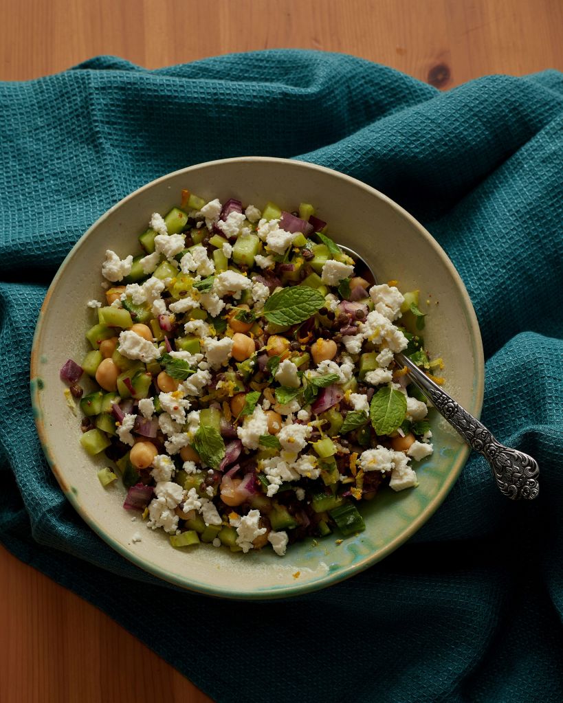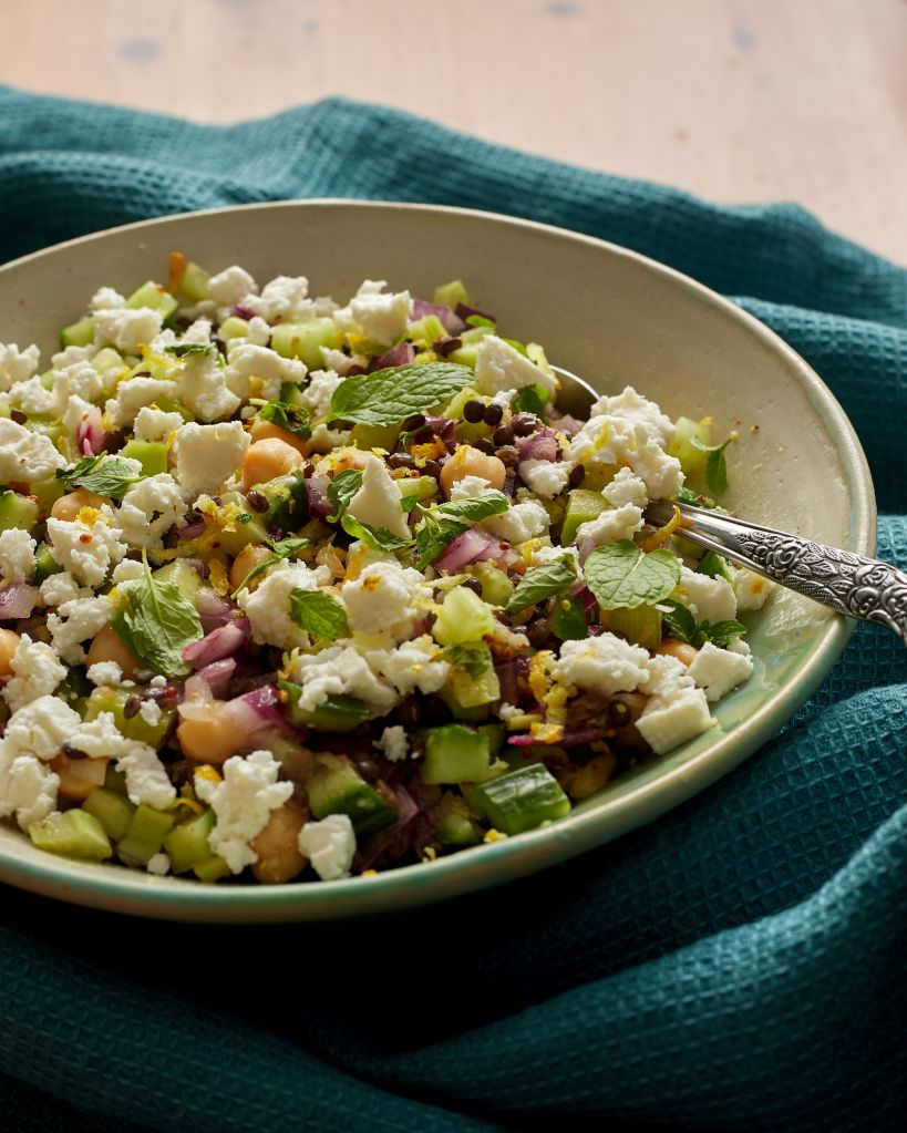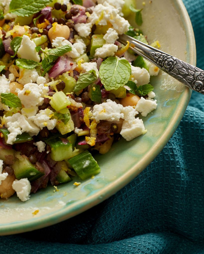 В купа смесете всичко с изключение на сиренето и разбъркайте. В малка купа смесете съставките за сос и разбъркайте до хомогенизиране. Полейте салатата и разбъркайте. Завършете със сиренето, лимоновата кора и прясната мента.