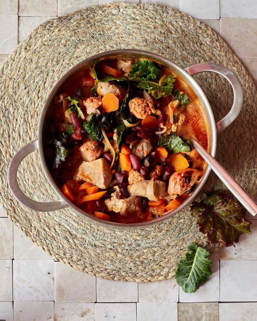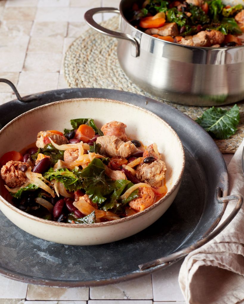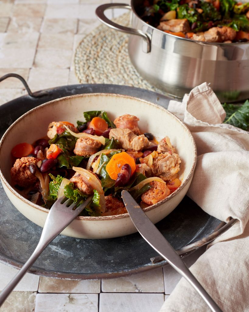В оригинала има свински ребра (аз не намерих и замених с обезкостен джолан), гърди, които са ми мазни и ги пропуснах, свински крака и кървавица, които със сигурност не бих яла, затова дори не ги потърсих. Другата модификация е кейлът. Оригиналът е с португалско зеле, каквото тук няма и кейлът е най-близката до него съставка. По отношение на приготвянето, промених последователността, понеже ползвах готово сварен боб от консерва.