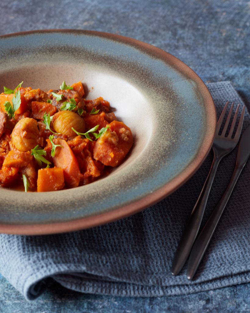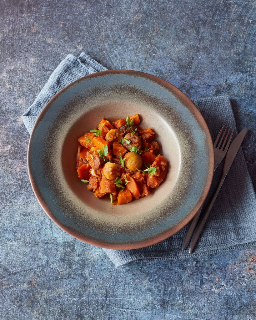 От тиквата, която използвах за предишната рецепта остана достатъчно за още две други – тази яхния и един десерт, който идва след няколко дни. В тази рецепта съчетах тиквата с кестени и чоризо. За веган версия можете да пропуснете месото – и без него би било много вкусно.