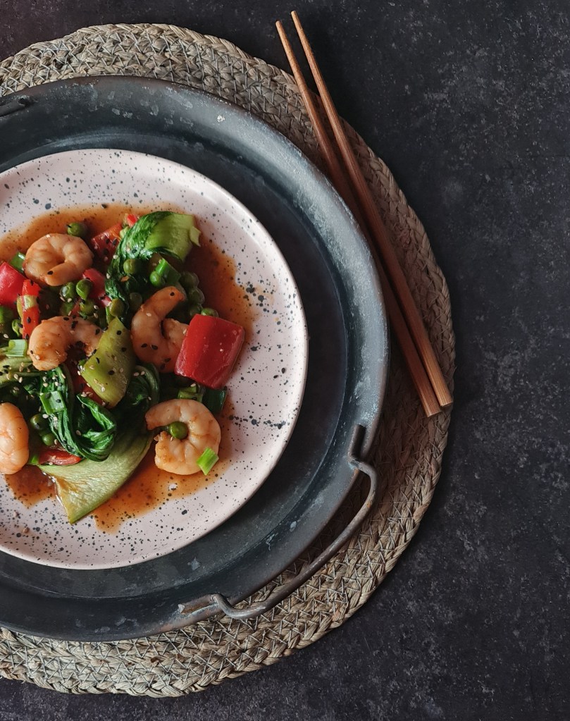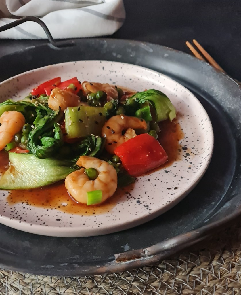 Това ястие е изключително подходящо, ако нямате много време или просто не искате да прекарате часове в кухнята. Направих го със скариди, но би станало и с пиле. Зеленчуците са, каквито имах – червена чушка, грах и пак чой. Моркови, зелени чушки, снежен грах също са много подходящи, в случай че ви се намират.