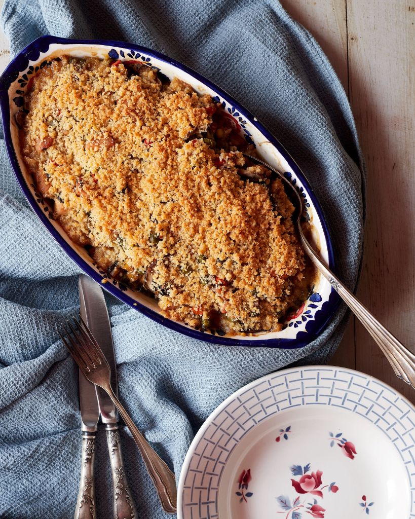 Прехвърлете в съда за печене, заравнете леко и печете 15 минути на ниско ниво във фурната. През това време пригответе трохите за коричката. Смесете настъргания пармезан, галетата и останалото масло в блендер и обработете до смесване. На 15тата минута извадете съда от фурната, разпределете трохите по повърхността и върнете, този път на средно ниво. Печете 15 минути, или докато коричката добие приятен златист загар.