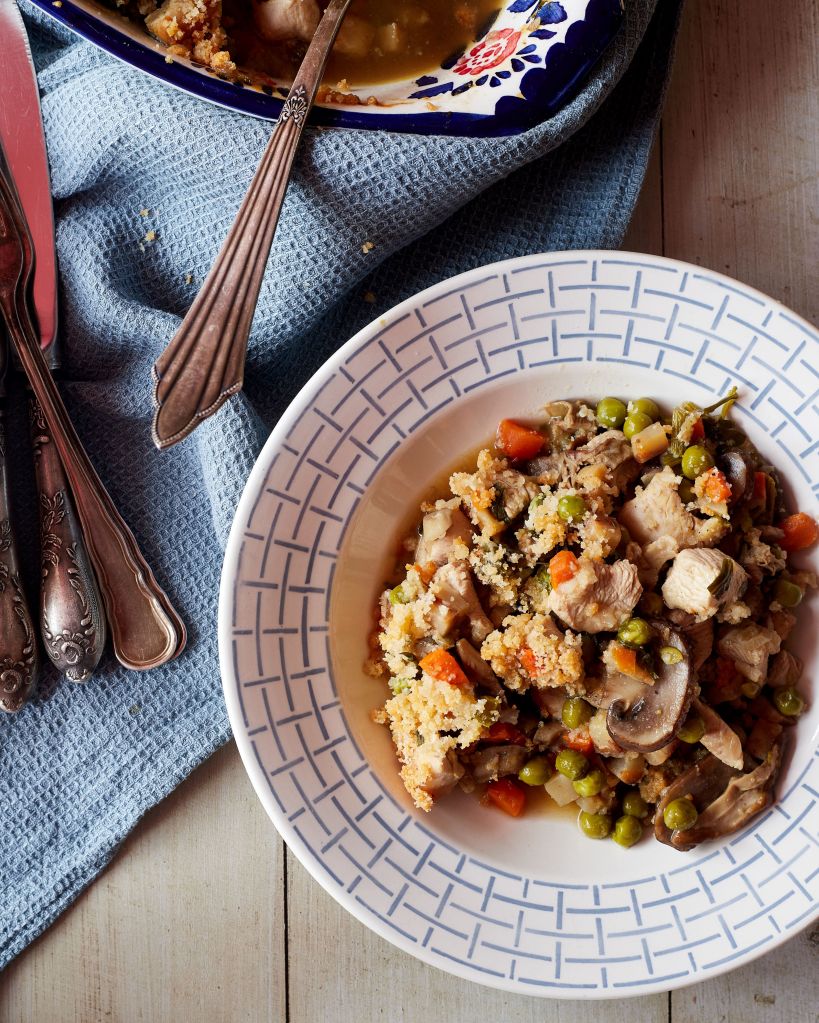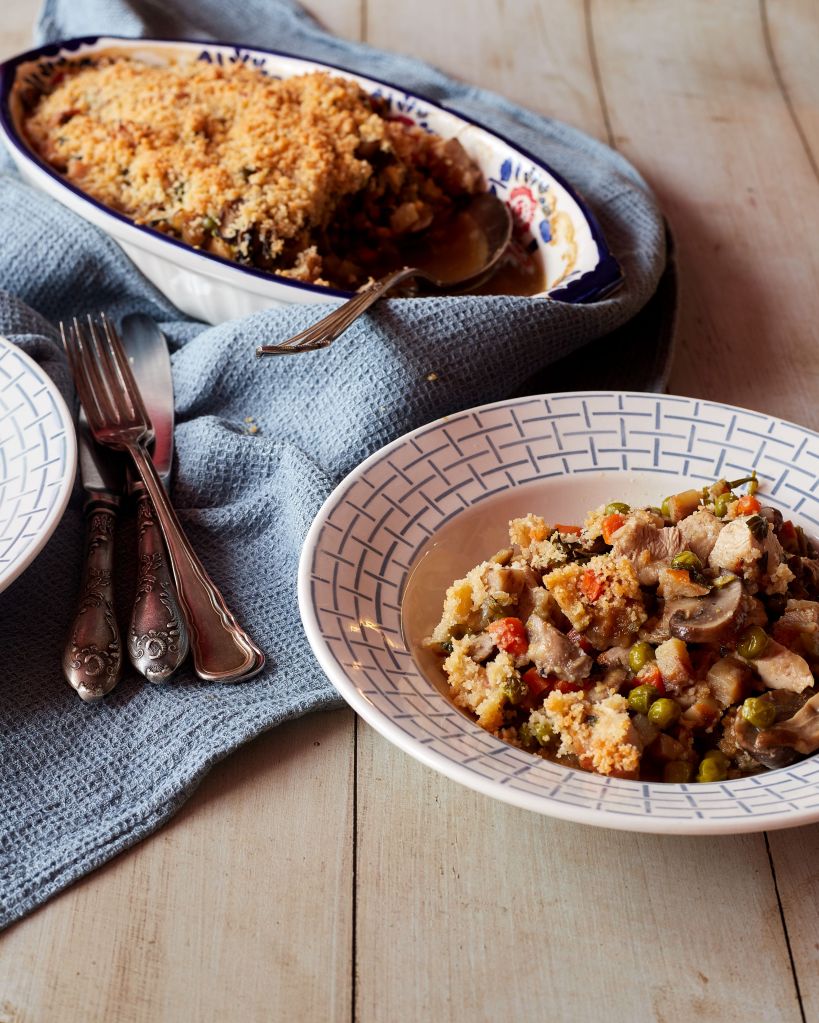 Пуешкото и гъбите правят рецептата високо протеинова с над 30 г във всяка порция. Ястието се приготвя в тенджера и спокойно може да се сервира и като яхния, но аз го прехвърлих в съд за печене и добавих тънък слой трохи от галета, пармезан и масло, който запекох до хрупкава коричка.