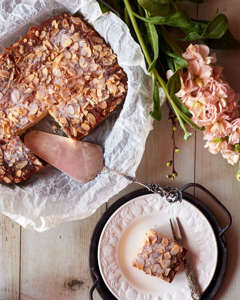 Прехвърлете в тавата, поръсете с филирани бадеми и печете около 60 – 65 минути. Наблюдавайте цвета и, ако започне много да потъмнява покрийте с хартия за печене, за да не прегори. Преди да извадите, пробвайте с клечка в средата. Може да поръсите с еритритол на пудра след изстиване.
