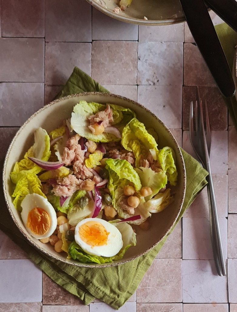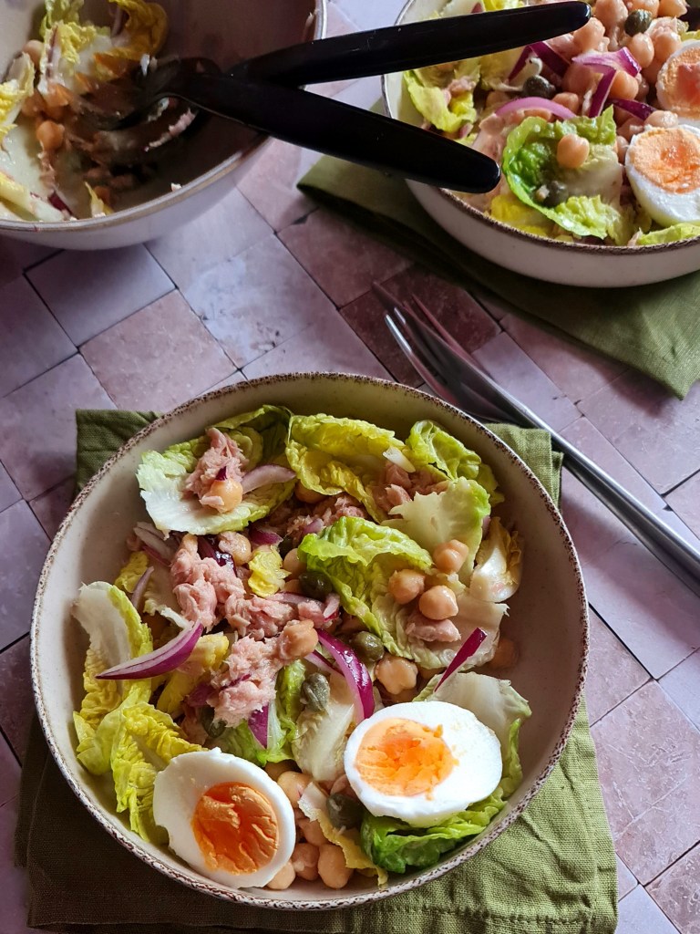В купа сложете салатата (по-големите листа накъсани). Добавете нахута и нарязания лук. Добавете соса и разбъркайте. Добавете рибата и каперсите и разбъркайте. Разделете между две чинии и добавете яйцата.