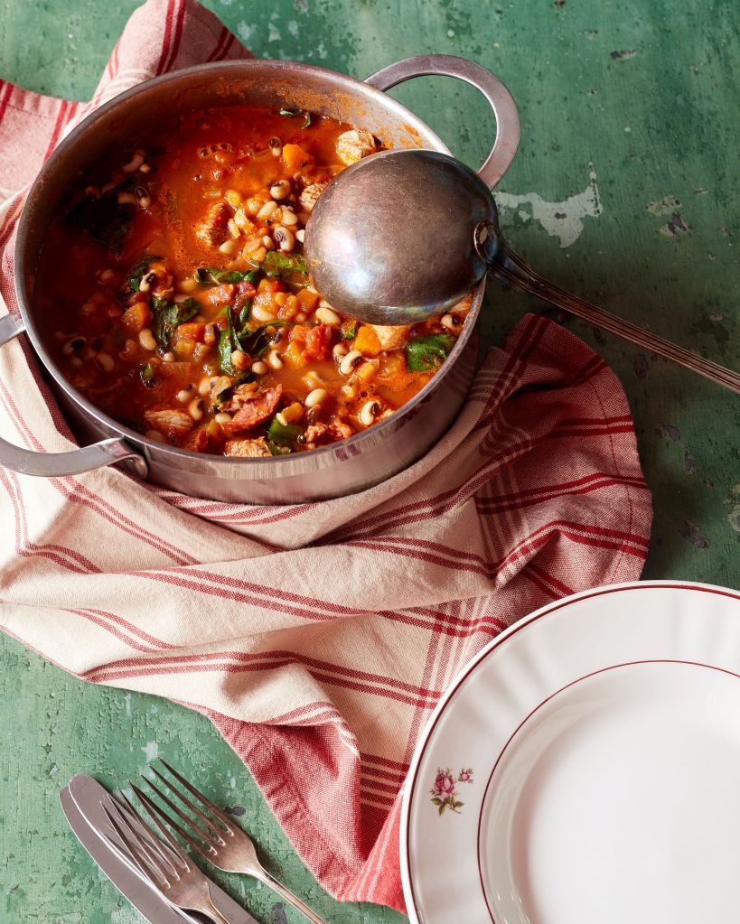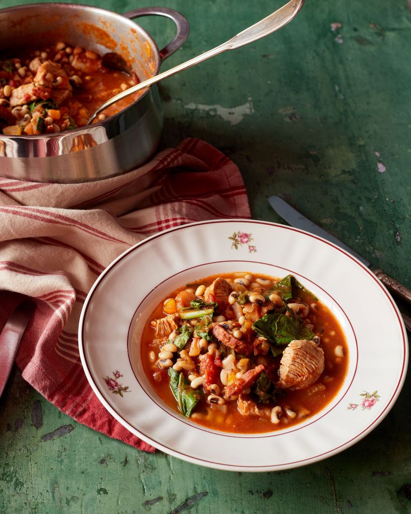 Тръгнах от наличните продукти – папуда, за която бях се сетила преди време и исках да я сготвя и пуешко. Основата е от лук, чесън, моркови, домати и селъри. Реших да добавя още чоризо и пушен пипер за аромат. Към края на готвенето, докато почти готовото ястие къкреше на котлона, се сетих за връзка манголд и добавих няколко листа, нарязани на дебели ленти.