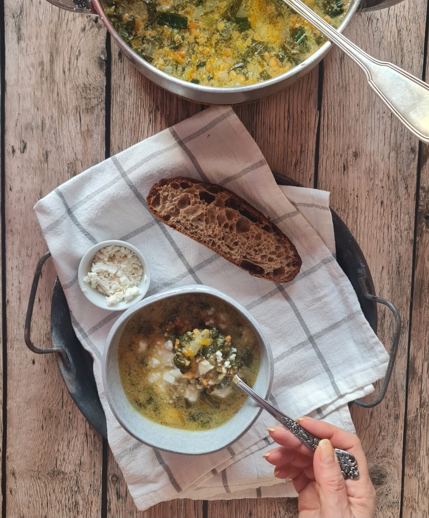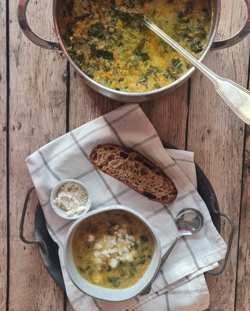 Първата ми истинска пролетна рецепта. Реших да е супа – леко и приятно хапване с дъх на нов живот. Имах лапад, но можете да я направите и с коприва или спанак. Добавих лук, настъргани моркови и връзка левурда.