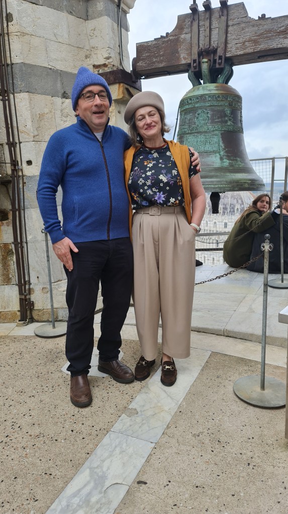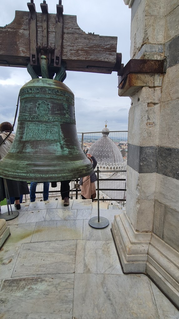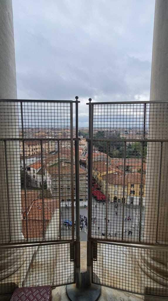 Ние, разбира се, не само „подпряхме“ кулата отвън, но и се качихме до камбанарията. Усещането е странно. Ъгълът на наклона е сериозен и при изкачване те тегли в едната посока. Дори каменните стъпала са изтъркани неравномерно. Гледката отгоре е прекрасна и определено си заслужава. Стълбите до терасата (около 200 – 220) са достатъчно широки, за да се разминат двама души. От терасата до камбанарията (около 20 – 30) са доста по-тесни и там не е възможно разминаване.
