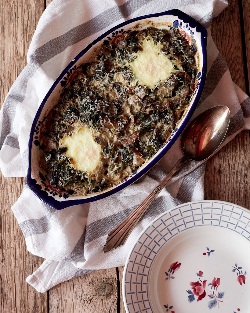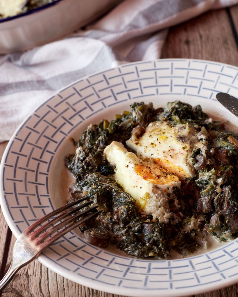 Пролет е и е ред на зелените чинии. Това лесно и бързо ястие, което напомня шакшука, може да се приготви както със спанак, така и с коприва, манголд, лобода, лапад или микс от тях. Можете да ползвате само зеленолистни или, като мен, да добавите и гъби за повече протеин (55 г в порция).