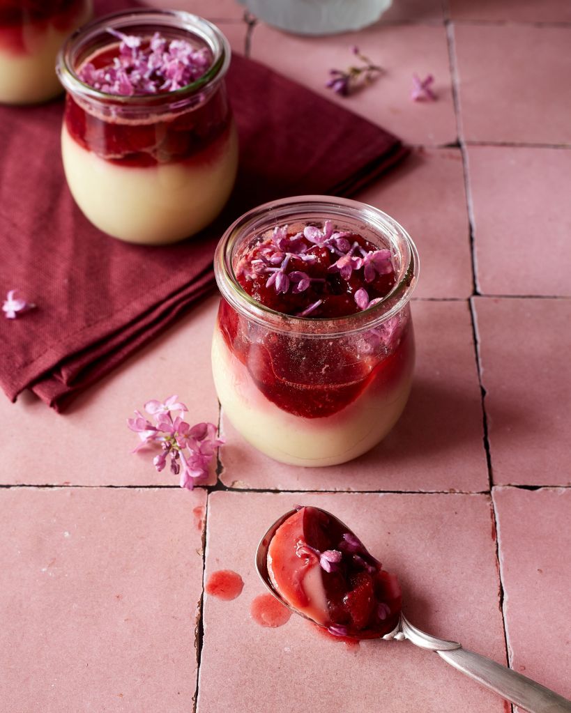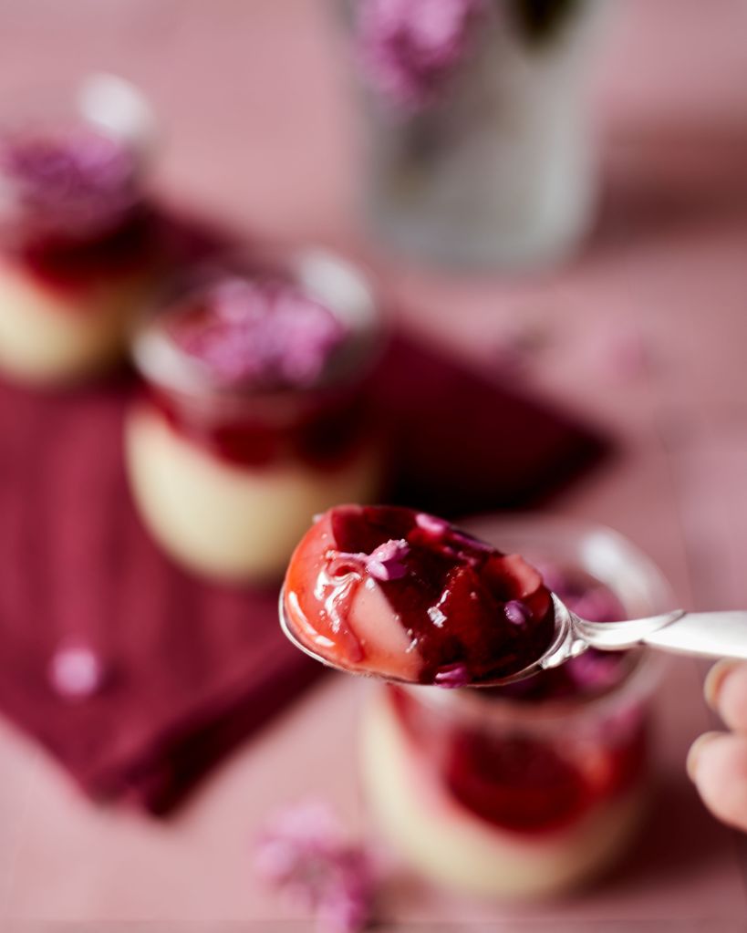 Сложете нарязаните ягоди, останалия еритритол и балсамовия оцет в малък съд и загрейте до къкрене. Гответе 10-ина минути, докато се сгъсти. Разделете на 5 части и ги добавете към панакотата. Приберете в хладилника до следващия ден.