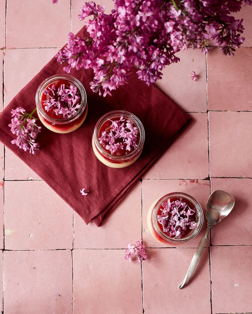 Ягодите са най-добрият приятел на ревена и са вцсезон горе-долу по едно и също време, така че лесно ги избрах за втори основен продукт. Исках и нещо специално, сезонно и необичайно. И така стигаме до люляка, който е напълно ядлив. Него го измих внимателно със студена вода, отделих цветчетата и още мокри ги покрих с еритритол на пудра (вие може да ползвате захар). Те завършиха десерта.