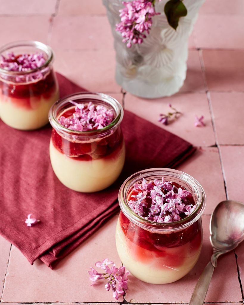 Тази крем е изключително вкусен. Всъщност това е панакота с добавено пюре от печен ревен. Може лесно да се веганизира, като млякото и сметаната се заменят с кокосови.