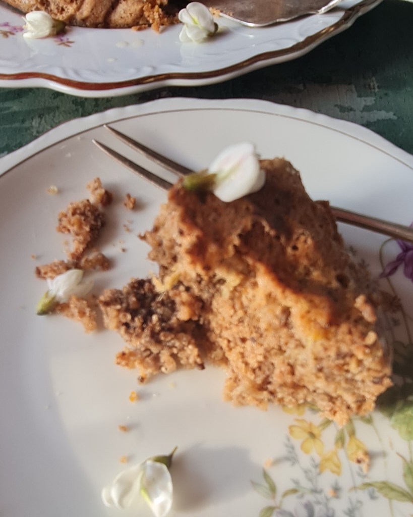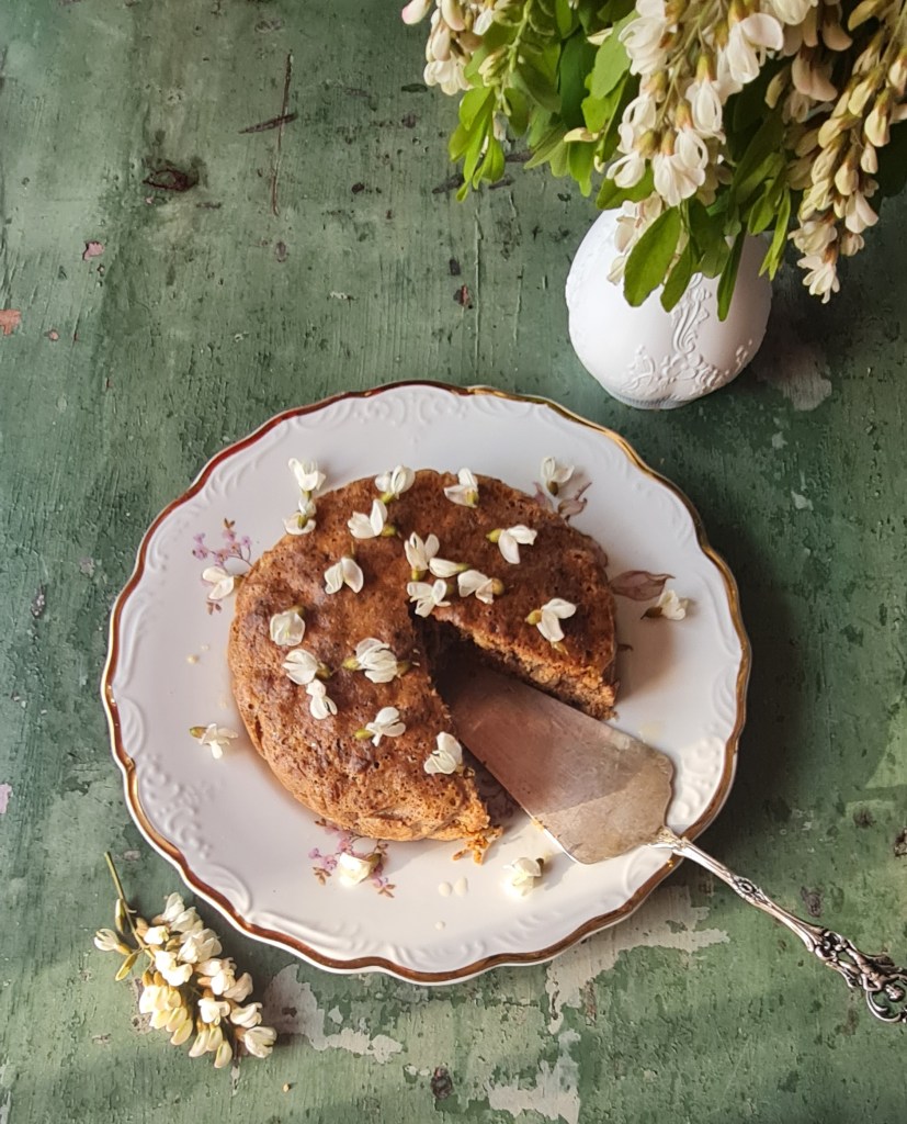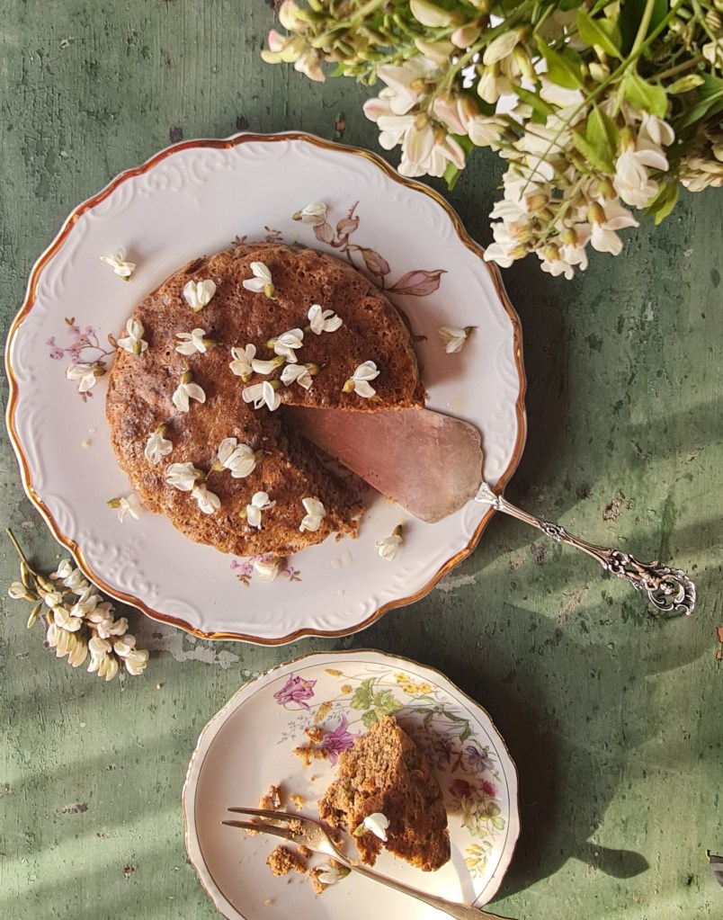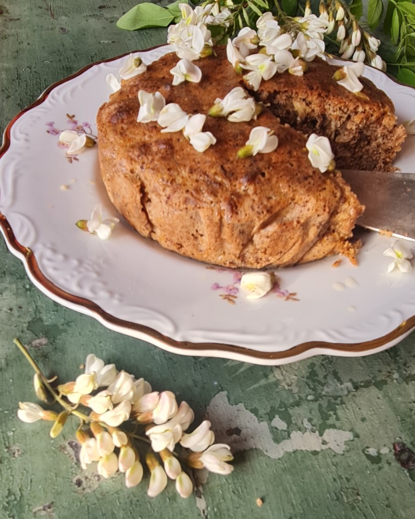 Този кейк е безглутенов. Направен е със смлени орехи и брашно от елда. В тестото влизат добре измитите и внимателно почистени венчелистчета на акацията, които, заедно с настърганата кора от портокал, придават на десерта неповторим аромат. Преди сервиране се сиропира със затоплен потокалов сок, в който е разтворена 1 супена лъжица акациев (или друг) мед.