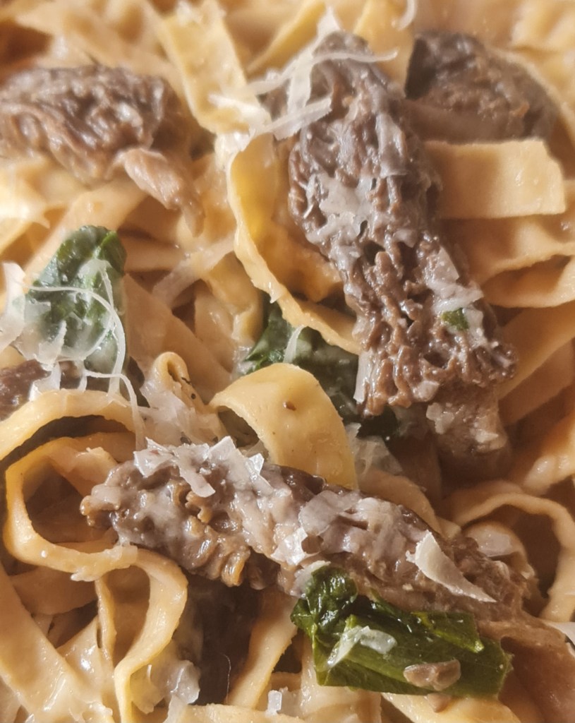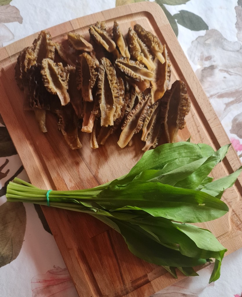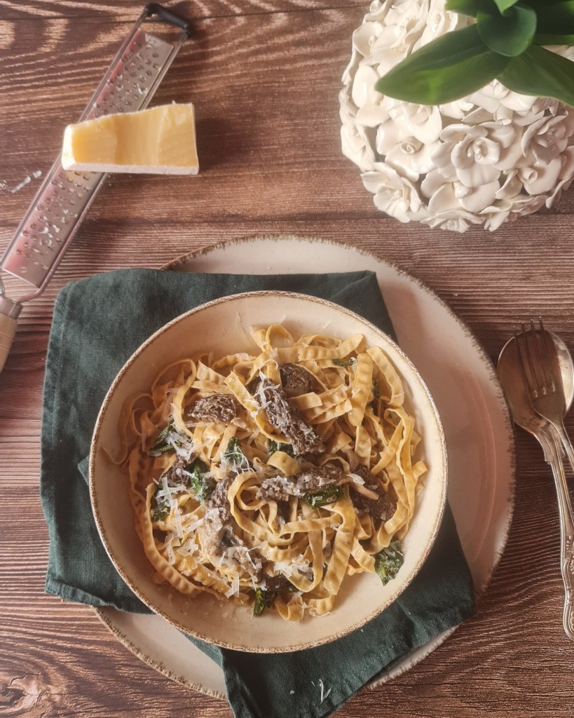 Аз съм успявала да се сдобия с нея всичко на всичко 2 пъти. Предишният път я направих като гарнитура към пиле. Сега реших да е бързо и лесно, или иначе казано – паста. Намерих една подобна рецепта (кредит най-долу) и я адаптирах към нашия вкус. За около 15 минути (без чистенето на гъбите) имахме прекрасен обяд.