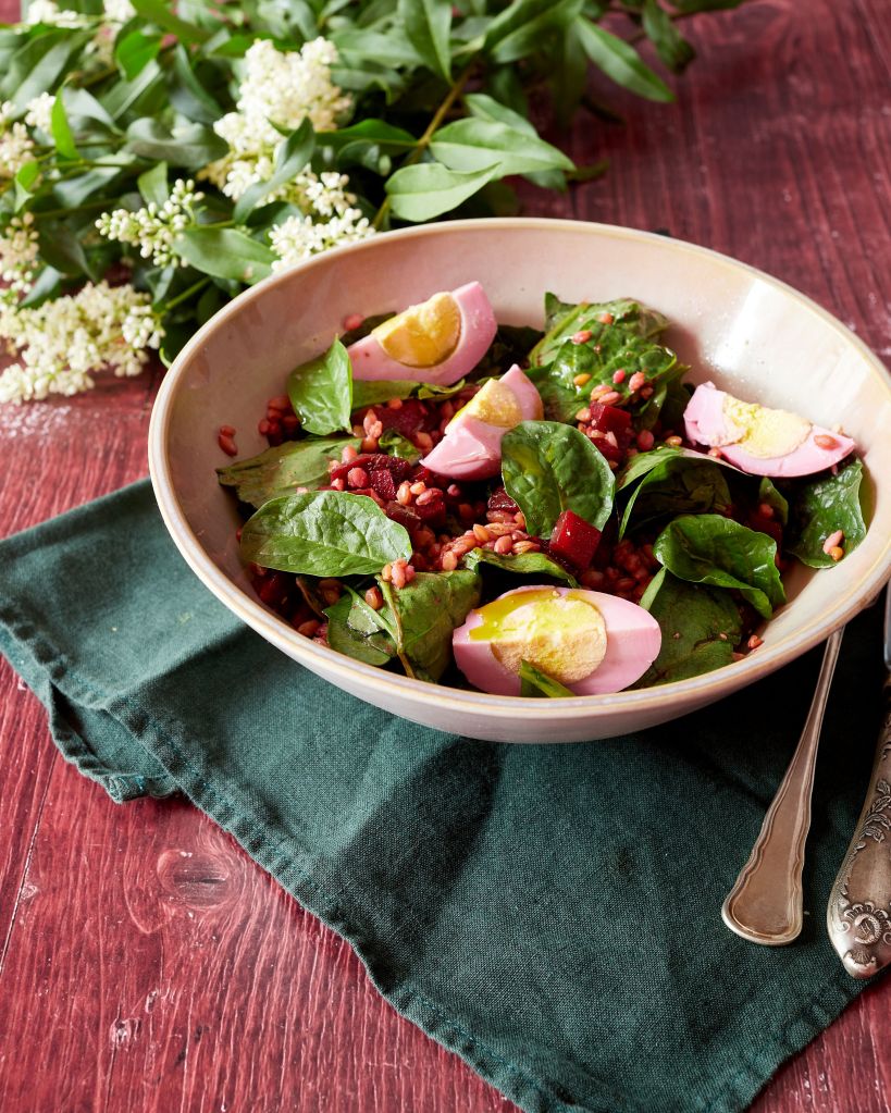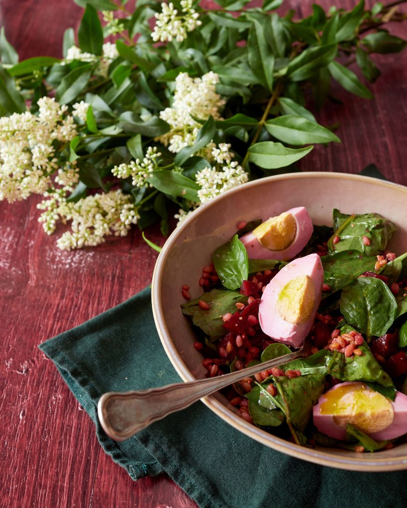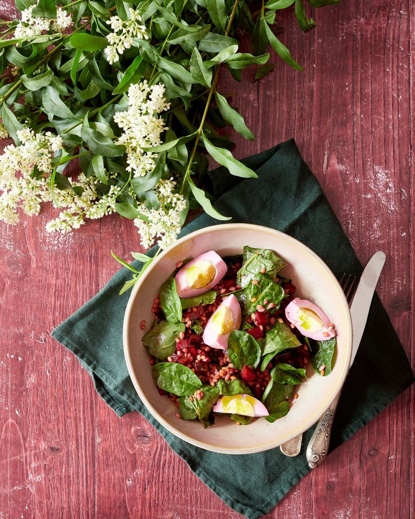 Не знам дали имате останали яйца от Великден, но за тази рецепта може да поискате да си сварите нови. Едновременно лека и засищаща, тя съчетава хрупкаво ферментирало цвекло, свеж спанак, лимец и оцветени в розово мариновани яйца.