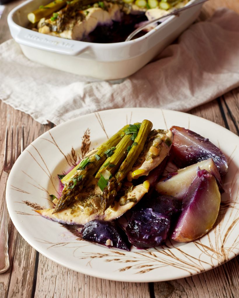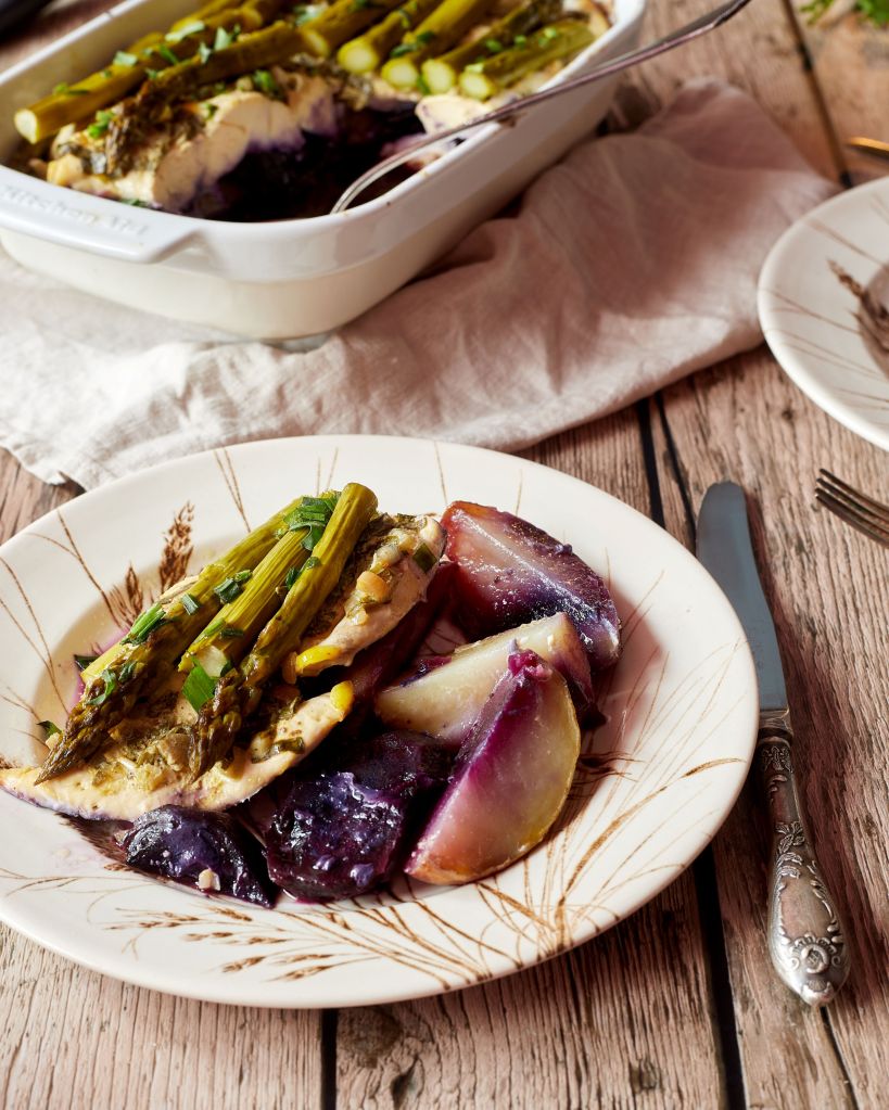 От серията „спасяваме забравени продукти“, това ястие е лесно, бързо и много вкусно. В него влязоха един голям лилав морков, отлежаващ в дъното на кошницата за зеленчуци повече от 2 месеца, няколко пресни картофа на 3 седмици и последната връзка аспержи от първата доставка – на почти 2 седмици. Имах пакет пилешко бон филе, да им прави компания във фурната.