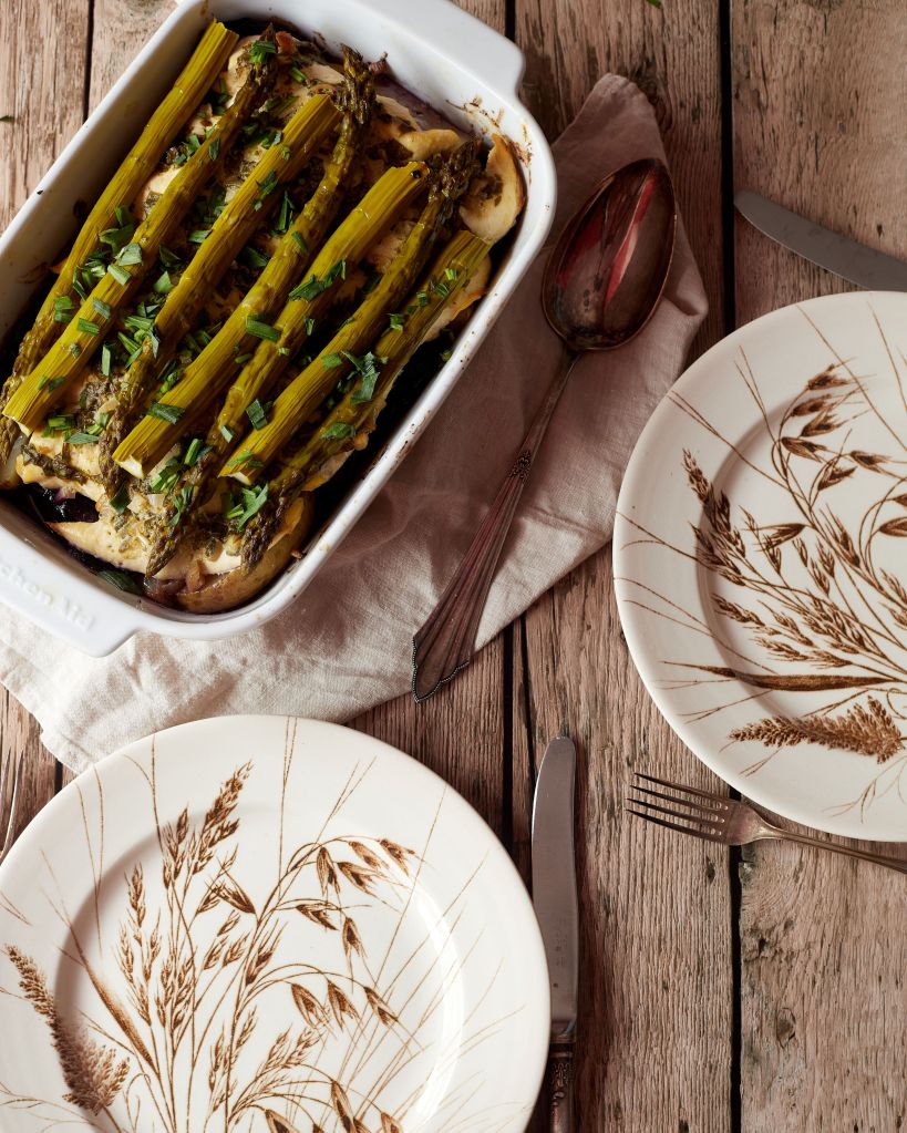 Последно най-отгоре наредете аспержите и напръскайте с останалия зехтин. Печете 10 минути. Сервирайте с прясно нрязан естрагон.
