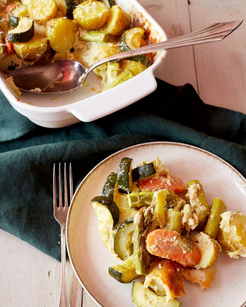 Още една рецепта, в която влизат пролетни зеленчуци. Възможностите на сезона са огромни и не бива да ги пропускаме. За това ястие бланширах моркови и пресни картофки и след това ги запекох на фурна с аспержи и тиквички.