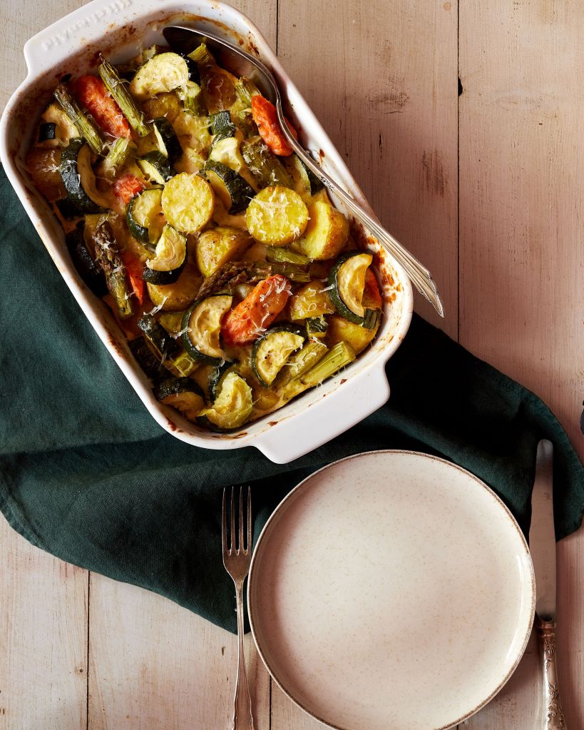 Загрейте фурната до 180 градуса и пригответе тава с размер приблизително 15 х 25 см, намазана със зехтин. В нея сложете бланшираните моркови и картови, тиквичките и аспержите и разбъркайте.