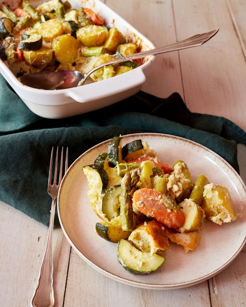 В купа разбийте яйцата със сметаната, горчицата и пюрето от левурда. Добавете 40 г чедър и подправете със сол и черен пипер. Залейте зеленчуците и печете около 30 минути – пробвайте с вилица, преди да извадите, за да сте сигурни, че зеленчуците са изпечени. Поръсете с останалия чедър и сервирайте.