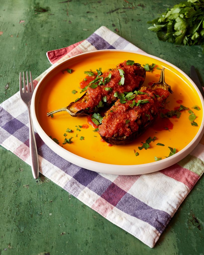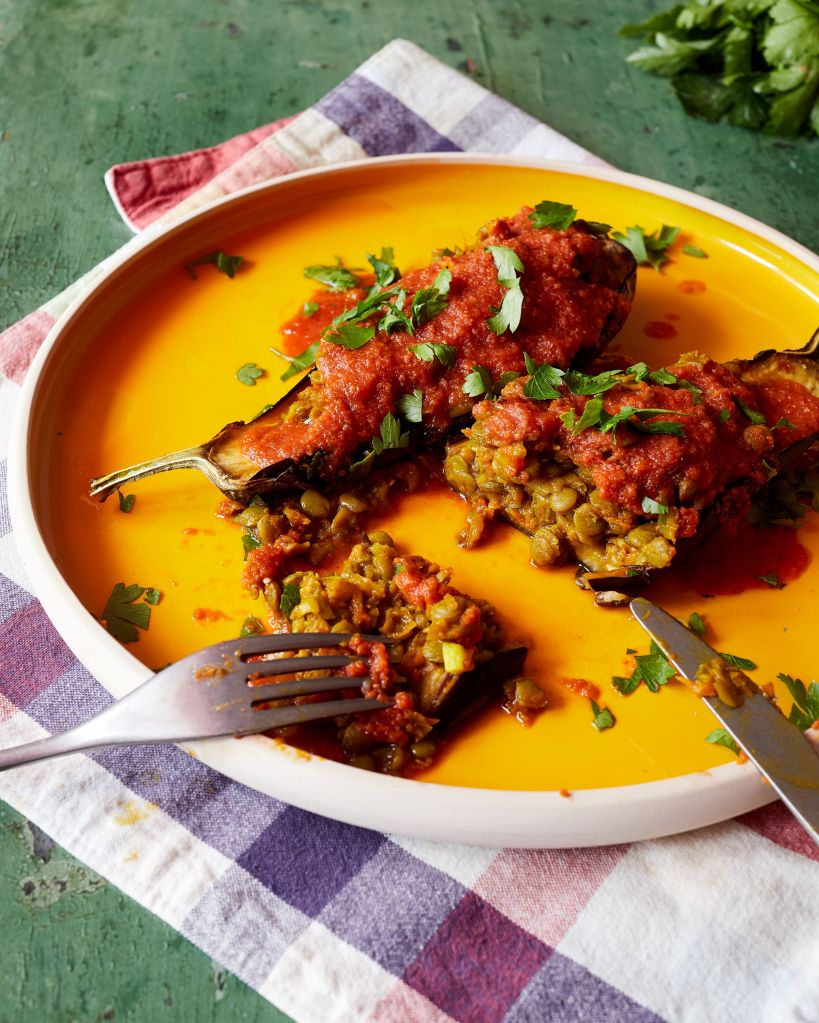 Едно от любимите ми ястия от ориенталската кухня е патладжан пълнен с говеждо мляно месо. Тази рецепта е подобна, но e веган. Замених месото с леща и подправих с масала. Добавих и домашен доматен сос и се получи много вкусно и доста бързо за приготвяне ястие.